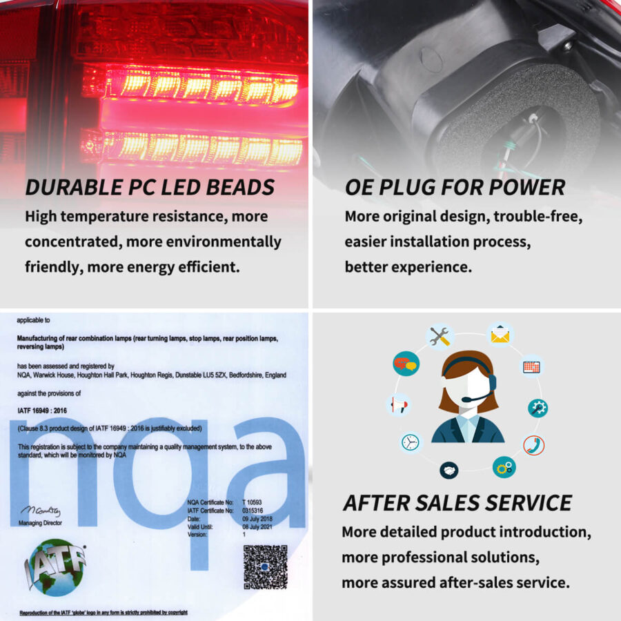 Our factory has American DOT, European E-Mark and Chinese CCC certification to assure product quality. In terms of appearance, we have the appearance and design patents of our car lights. As for production capacity, our factory has IATF 16949 auto parts production management system and ISO 9001 quality management system certification standards.
