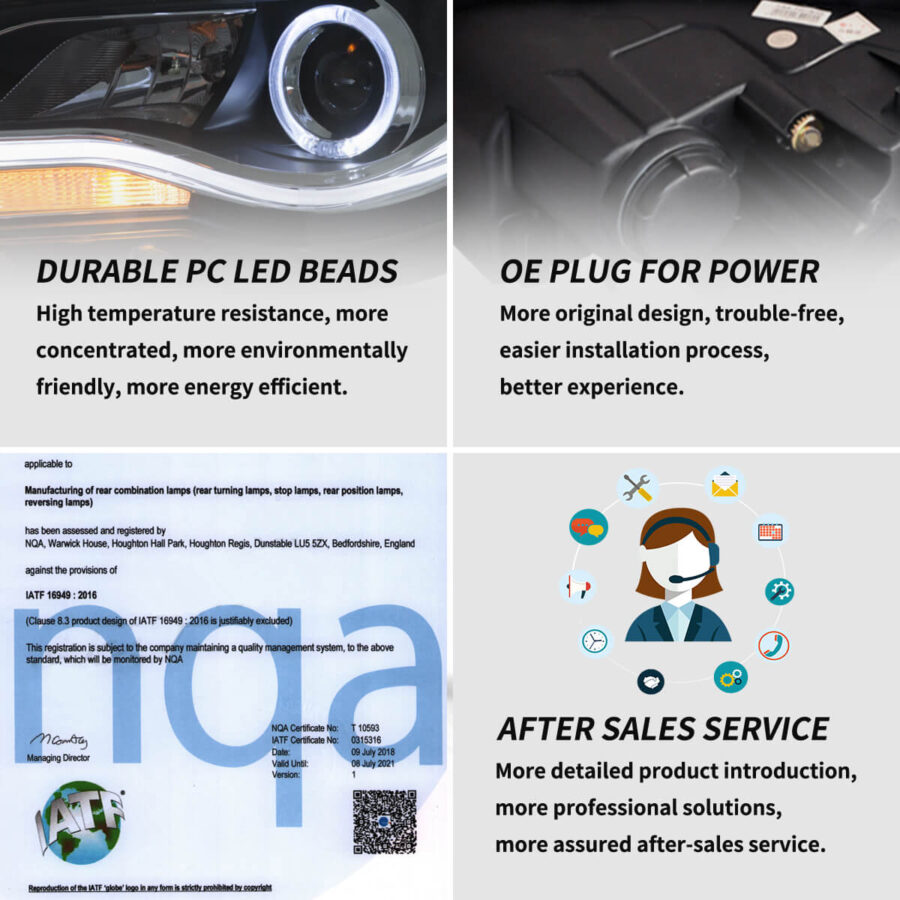 Our factory has American DOT, European E-Mark and Chinese CCC certification to assure product quality. In terms of appearance, we have the appearance and design patents of our car lights. As for production capacity, our factory has IATF 16949 auto parts production management system and ISO 9001 quality management system certification standards.