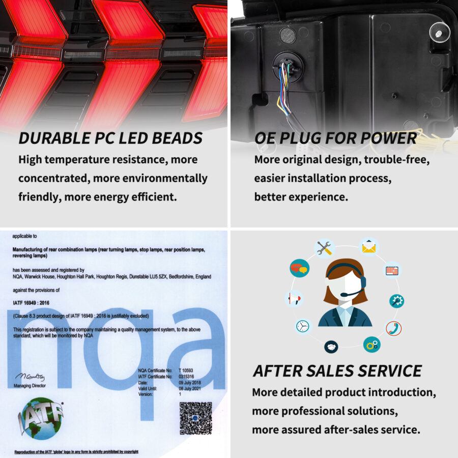 Our factory has American DOT, European E-Mark and Chinese CCC certification to assure product quality. In terms of appearance, we have the appearance and design patents of our car lights. As for production capacity, our factory has IATF 16949 auto parts production management system and ISO 9001 quality management system certification standards.