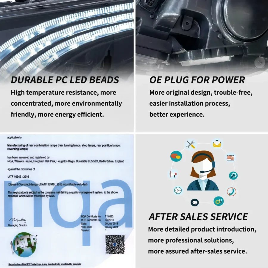 Our factory has American DOT, European E-Mark and Chinese CCC certification to assure product quality. In terms of appearance, we have appearance and design patents of our car lights. As for production capacity, our factory has IATF 16949 auto parts production management system and ISO 9001 quality management system certification standards.