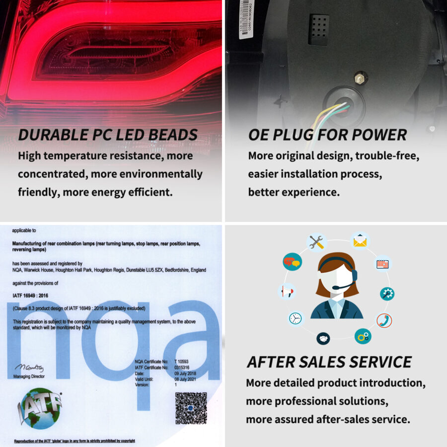 Our factory has American DOT, European E-Mark and Chinese CCC certification to assure product quality. In terms of appearance, we have the appearance and design patents of our car lights. As for production capacity, our factory has IATF 16949 auto parts production management system and ISO 9001 quality management system certification standards.