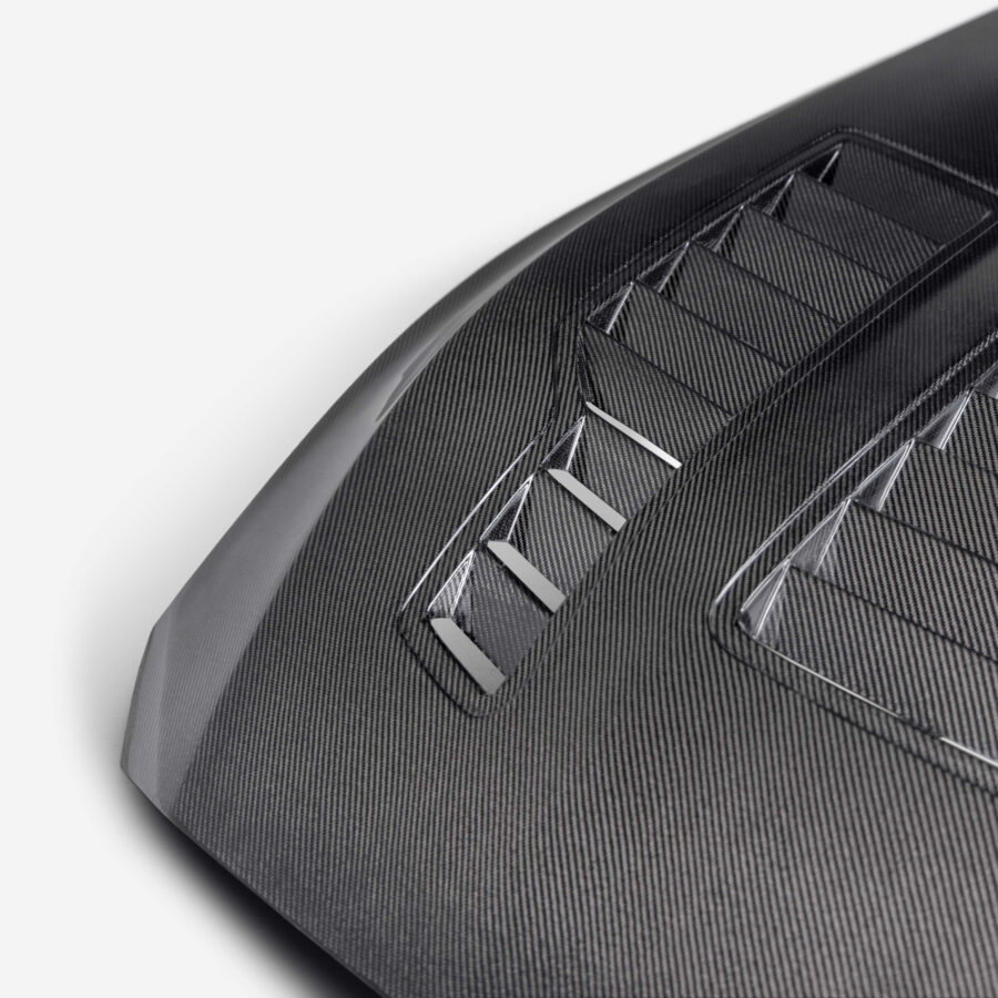 Double Sided construction – carbon fiber “skeleton” bonded to underside of carbon fiber hood – reduced weight.