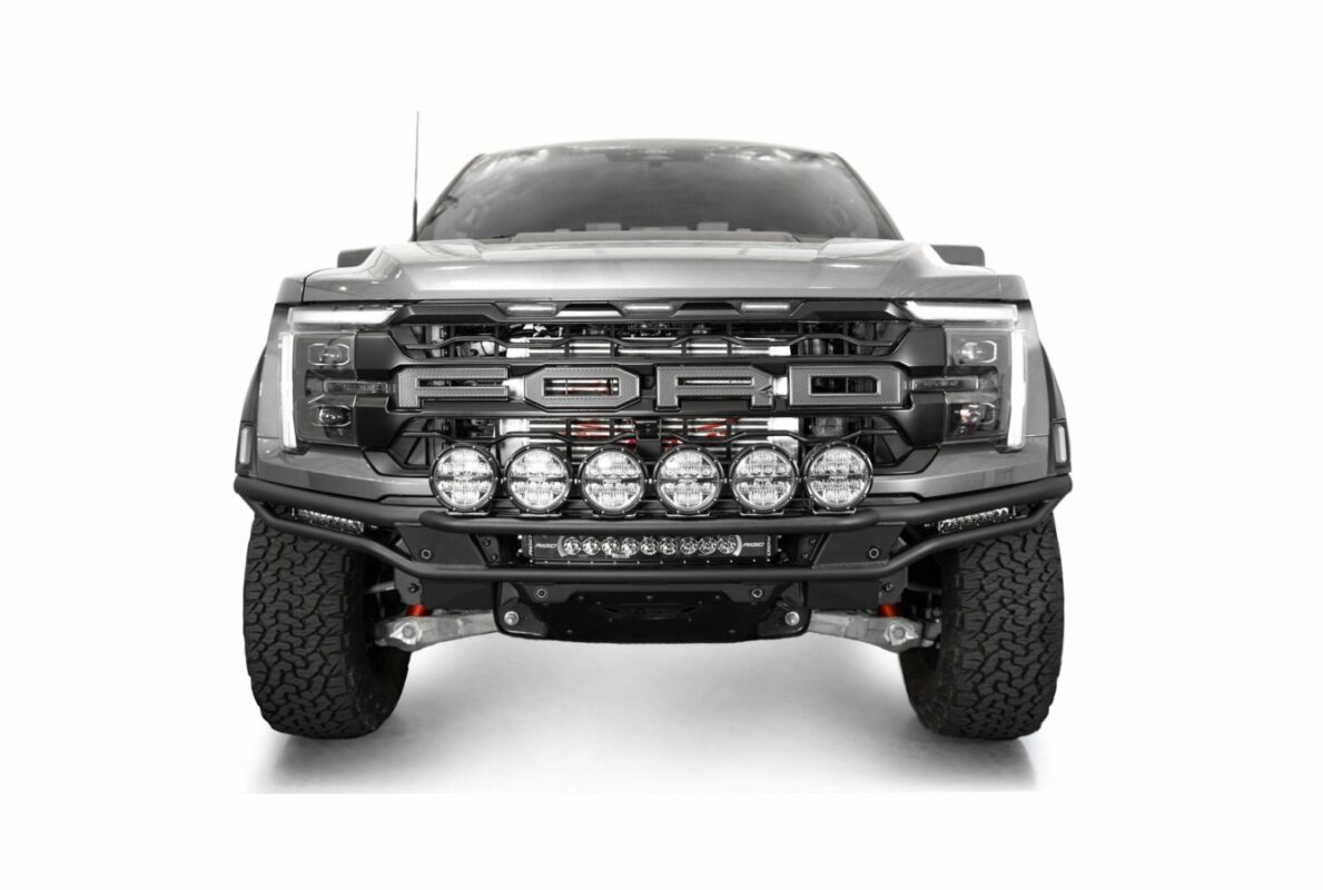 Our F-150 Raptor Race Series Front Bumper features an aggressive tubular build with a low-profile design inspired by desert racing. The top tube is radiused and closely follows the front body line. With higher clearance, you can avoid taller off-road obstacles, especially when traveling faster. The center dual-row 20-inch light bar mount and two side single-row 10-inch light bar mounts improve trail lighting in dark or dusty conditions. The included 1/8-inch aluminum skid plate provides additional protection to the front underbody of your truck and is finished with a durable satin black powder coat.