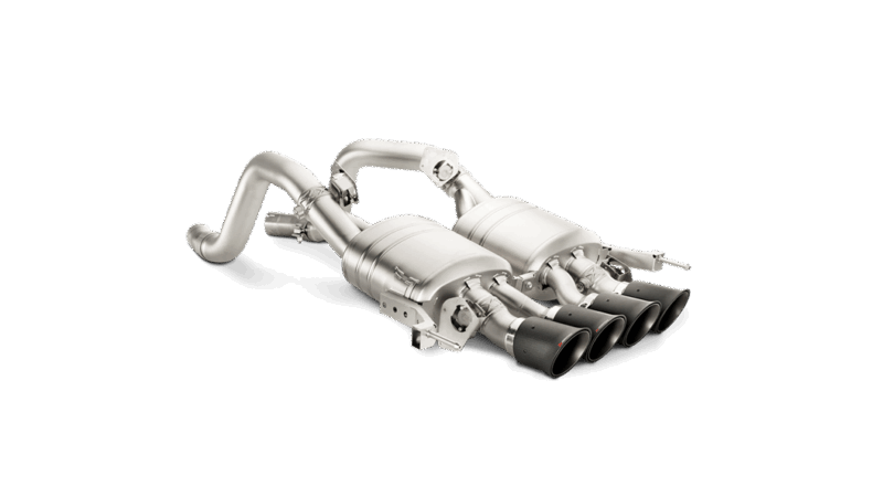 The Akrapoviฤ Slip-On Line system is the first step in exhaust tuning. Crafted from high-grade titanium, which considerably reduces the weight in comparison to the stock system, it has been perfectly designed to fit directly onto the existing link pipes. The system increases power, providesย better throttle response, and improves torque, and also conjures upย an amazing soundย from the naturally-aspirated V8 engine. The Slip-On Line system has four valves, designed for the first pair to operate in four-cylinder mode and the second set to come into action according to the driverโs specifications. The system is developed to be compatible with the carโs drive mode selector, and Akrapoviฤ engineers have developed an electronic device to drive the exhaust valves for each modeโWeather, Eco, Tour, Sport, and Trackโgiving the driver an even greater opportunity toย enjoy the sound of the Akrapoviฤ Slip-On Line across the whole spectrum of the carโs performance. Itโs topped off by four large-diameter carbon-fiber tailpipes with titanium inners, to make the Slip-On clearly recognizable as an exhaust that means business.