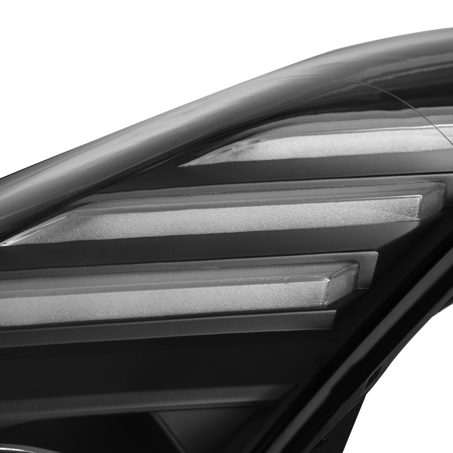 Not one. Not two. Three individually-housed LED projectors stacked in a 3D ice-cube arrangement. Low beam fires all three for a massive spread of light. High beam activates the inner two for concentrated punch when you need to reach out. The projector lenses sit deep in the housing for a dimensional look that flat LEDs can’t touch.