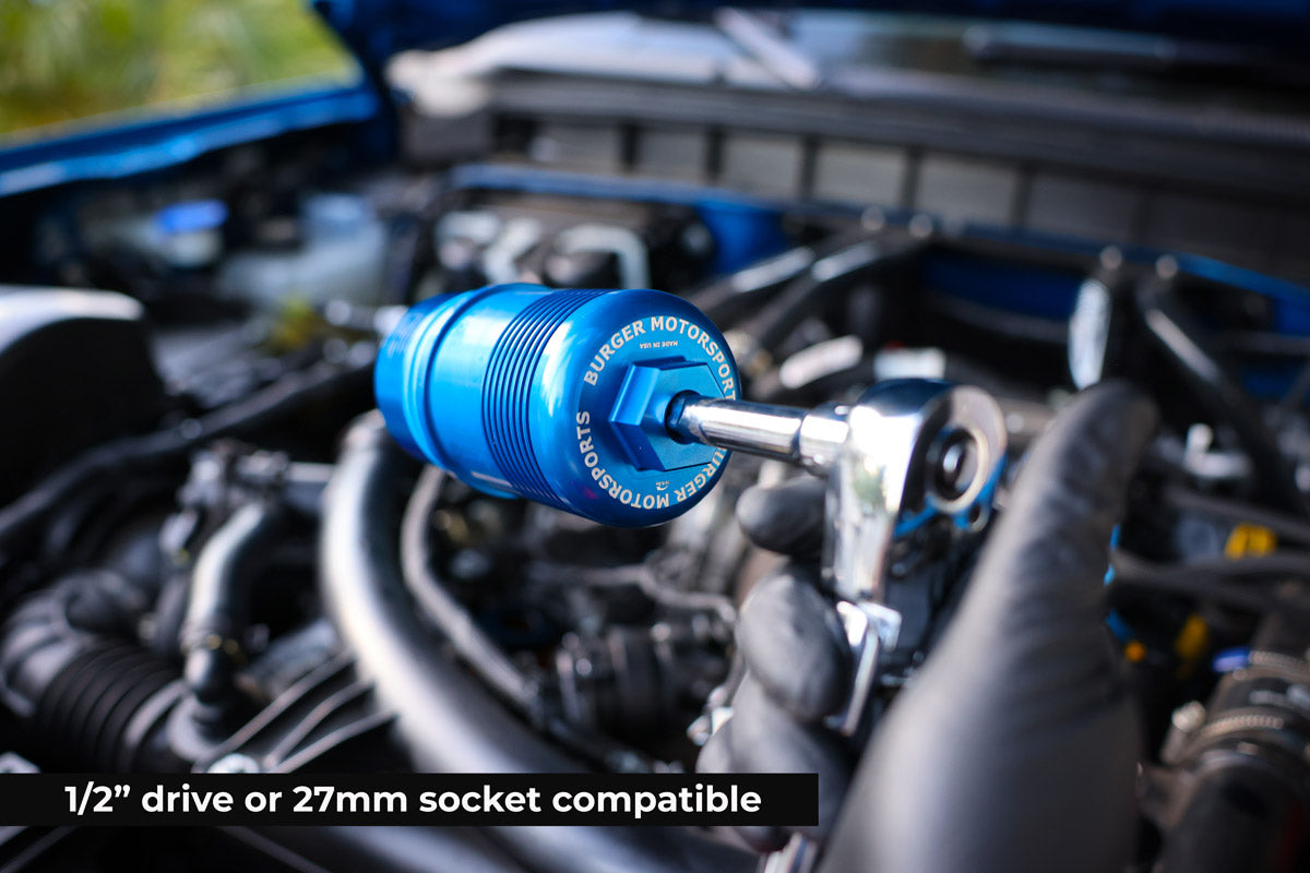 The Burger Motorsports billet aluminum magnetic Bronco oil filter cover directly replaces your weak OE plastic cap for greater protection, ease of removal/install, and great looks under the hood. You can use a 3/8″ inch drive ratchet or torque wrench to install and remove. The built-in 32mm hex head does not require a special removal/install tool like the factory cap. Uses the OE oil filter, filter housing o-ring, and filter insert. Anodized for protection. This quality part is a must for any serious Bronco owner.