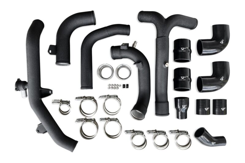 Complete hot-side and cold-side aluminum charge pipe kit for 2.7L Bronco and Ranger. Replaces restrictive factory plastic pipes with high-flow aluminum construction. CVF Lifetime Warranty included.