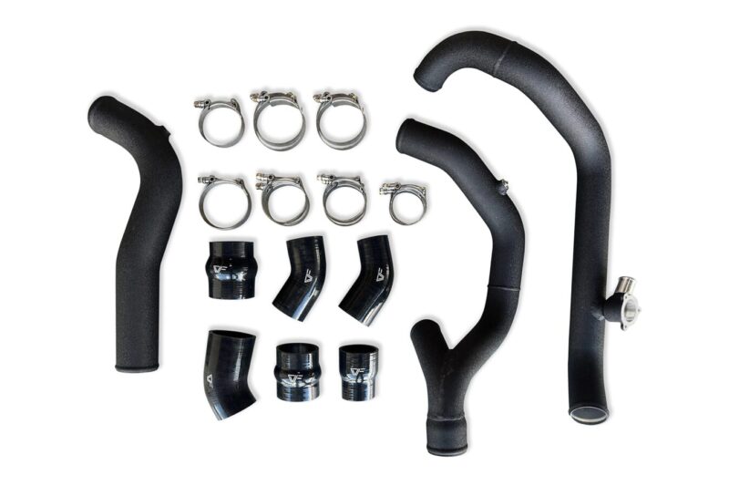 The CVF Aluminum Intercooler Hot + Cold Pipe Kit eliminates the crumpled section of the connection from the intercooler to the throttle body to maximize airflow (and help reduce charge air temps.). The expanded hot-side piping also flows more air into the intercooler.
