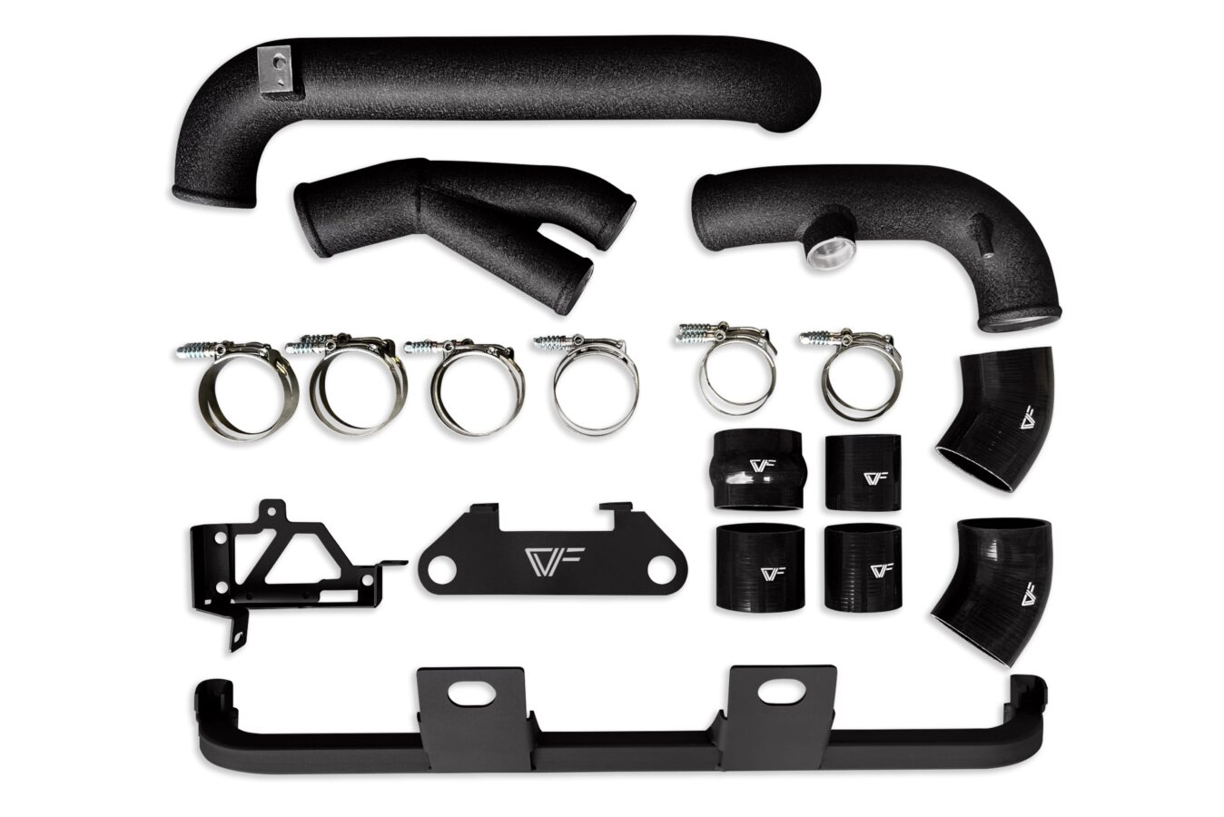 Manufactured from top-grade aluminum and accompanied by upgraded intercooler piping (also aluminum), the CVF Titan High Mount Intercooler features a TIG-welded proprietary bar-and-plate design for maximum durability and fully cast end tanks (imprinted with the CVF logo) to ensure maximum flow of air into the unit and out to your turbo – equaling more consistent airflow and more HP.