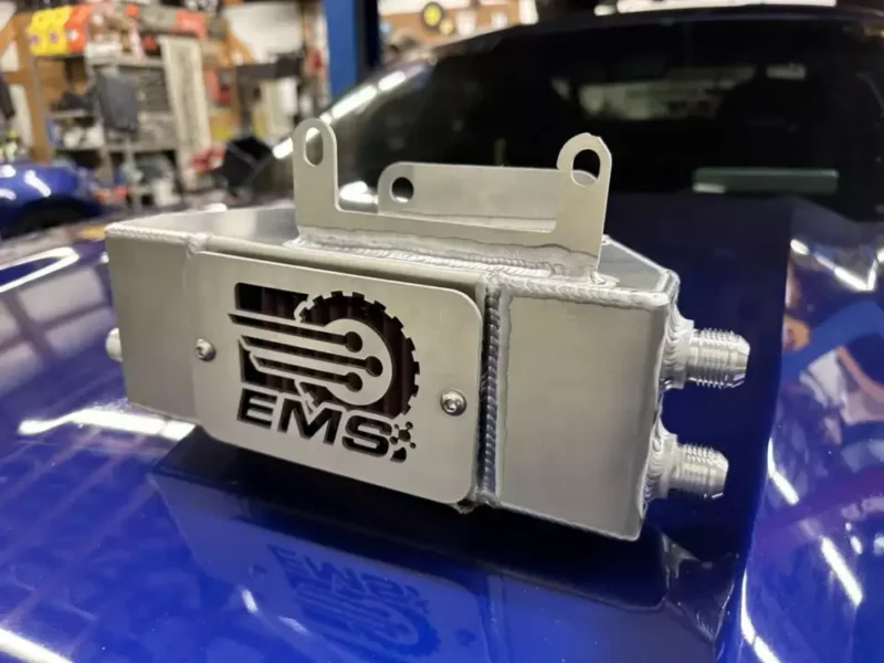 Our system utilizes three -10 lines, two from the Radium breather plate included in the kit and one from the valve cover. This ensures the maximum flow from the crankcase pressure into our catch tank and is vented to the atmosphere, instead of into your engine, through the HKS foam filter on top. The tank has several baffles and a steel-wool-lined layer to ensure that the gas, oil, and water are contained in the tank and can be disposed of properly during oil changes or between track passes.