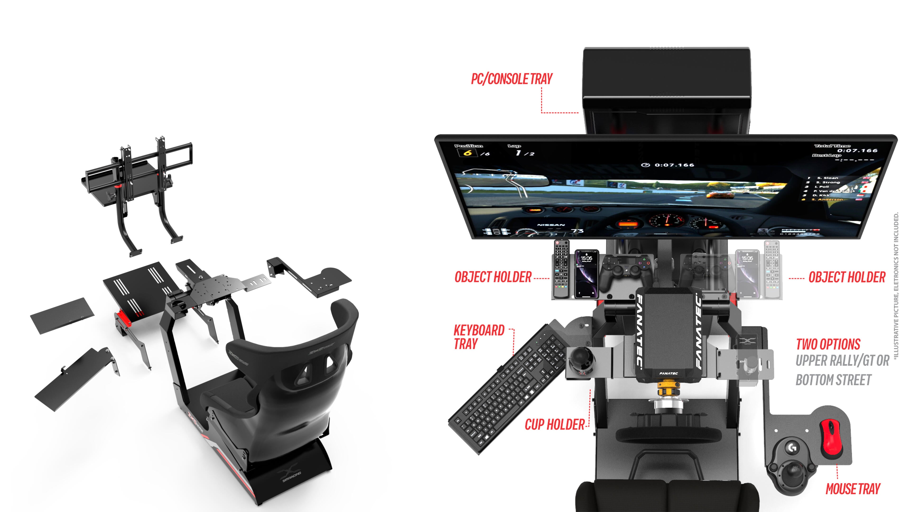 Enhance your setup with the Chassis 3.0, which is compatible with major brands like SIMGIC, Fanatec, Logitech, and Thrustmaster. Its integrated TV stand supports up to 49″ Ultra Wide monitors or multiple screens, plus a versatile cup holder, articulated workstation keyboard, and more for ultimate organization.