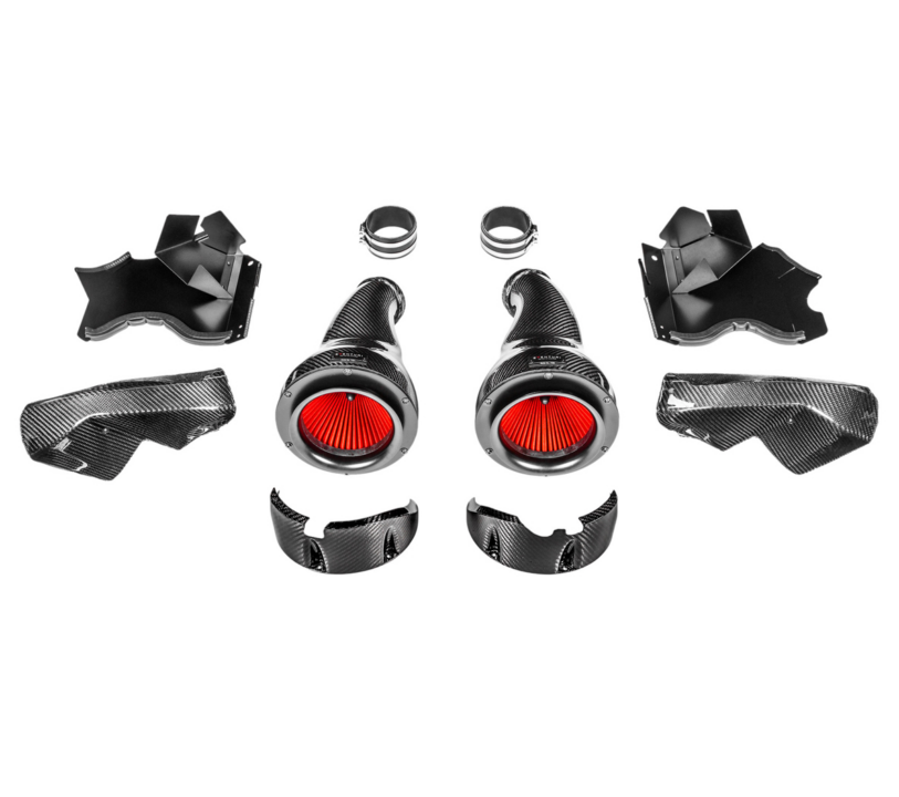 The F92 M8 Eventuri intake system was developed through extensive real world testing and airflow simulation analysis. It features sealed filter housings to maintain a steady IAT, even while stationary. The shrouds which seal the housings, coupled with our scoop and shield combination ensures unrestricted airflow whilst maintaining low IATs through cold air saturation. Our large front air scoops transfer ambient air directly into the intake area thus ensuring the engine doesn’t suffer from heat soak. In addition, our gold heat-reflective lined shields have integrated flow guides which direct the ambient air from the scoops into the filters. We have also managed to increase the inlet tube cross-sectional area by over 30% compared to the stock intake as it feeds through the openings in the strut braces. This allows the turbos to work more with less restriction and reduce the waste-gate duty cycles.