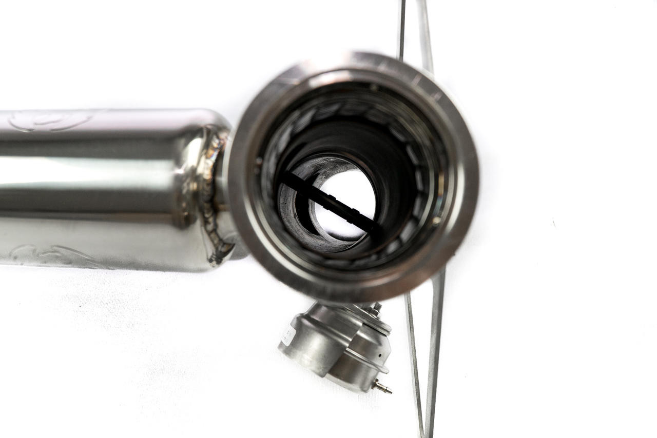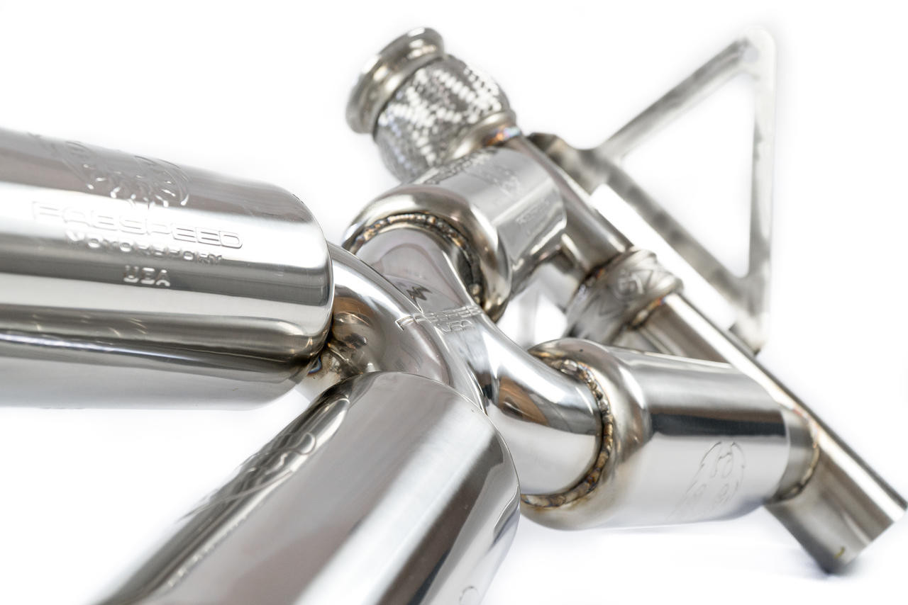 VALVES CLOSED: Exhaust flow is channeled through Fabspeed’s signature 63.5mm 2.5″ Quad-Resonated X-pipe. They engineered it specifically to smooth out exhaust pulses for a sophisticated and exotic ripping exhaust note while being as free flowing as possible with a noticeable improvement in performance over OEM. The tone is perfect for cruising around town or long highway drives.