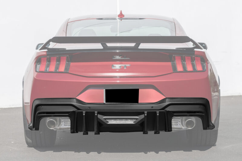 This rear bumper diffuser fits all 2024+ Ford Mustang S650 models with dual tips.