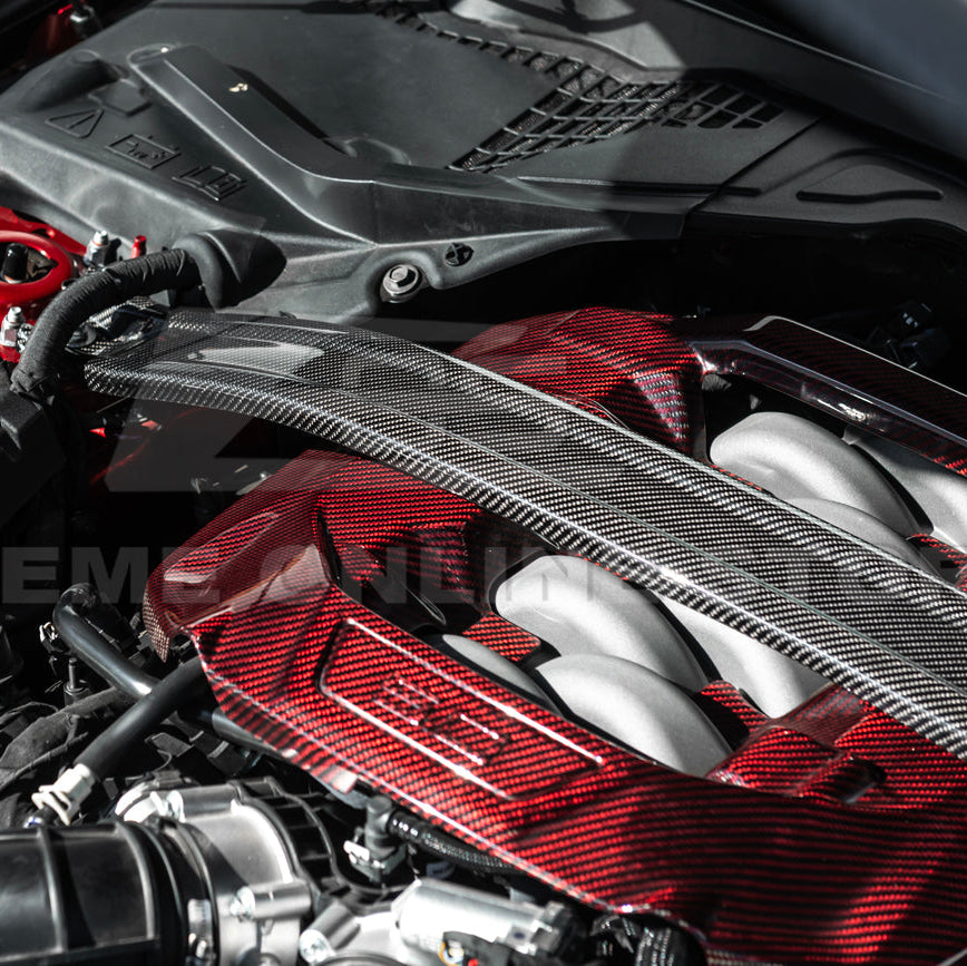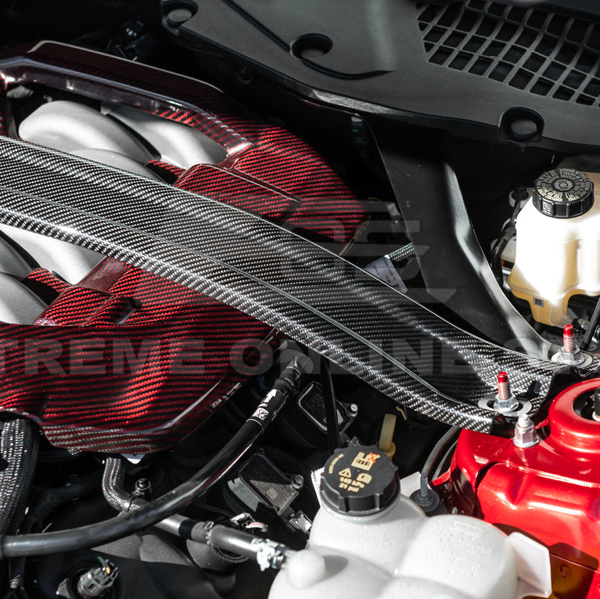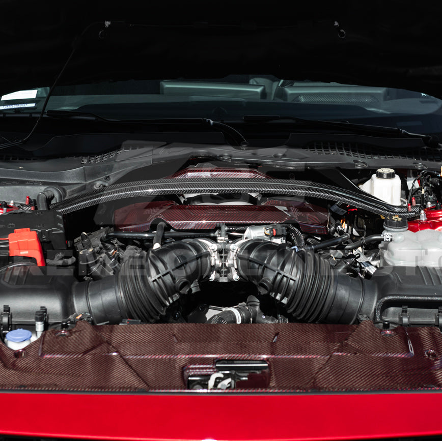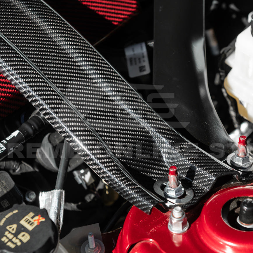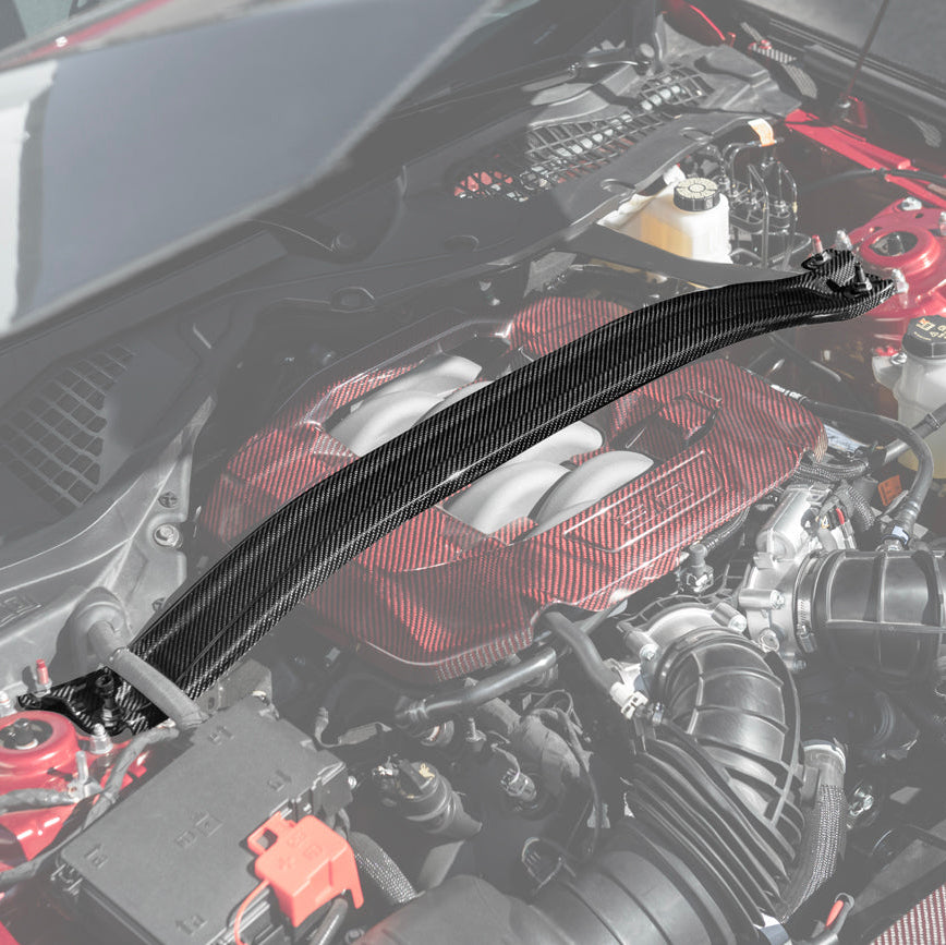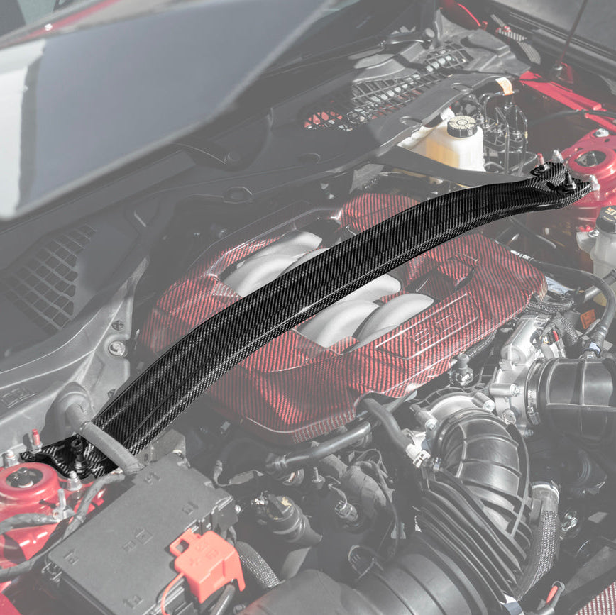 Styled after the S650 Dark Horse, this carbon fiber strut bar also serves as a visual centerpiece in the engine bay. The exposed carbon weave delivers a high-end, performance-focused appearance that perfectly complements other carbon fiber engine bay components. Precision-engineered to factory specifications, the brace bolts directly to OEM mounting points and reuses the original hardware, ensuring a clean, factory-correct installation with no drilling or modification required.