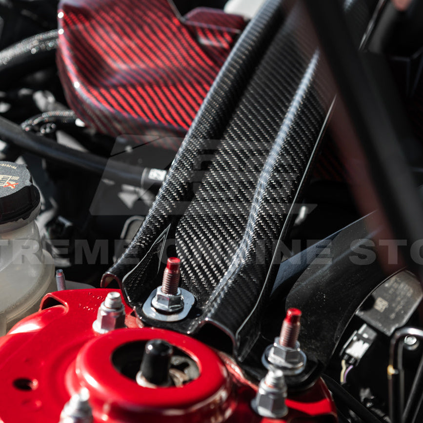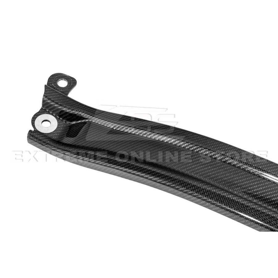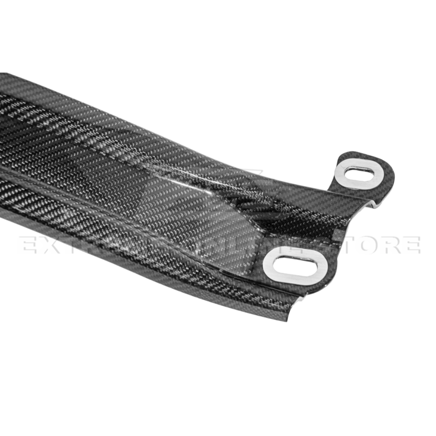 Constructed from premium dry pre-preg carbon fiber, this strut bar offers exceptional rigidity while significantly reducing weight compared to the factory metal brace. The result is improved chassis stiffness across the front shock towers, helping reduce flex under hard acceleration, braking, and cornering. This added rigidity translates into more predictable handling and enhanced front-end response—especially noticeable during spirited driving or high-speed maneuvers.