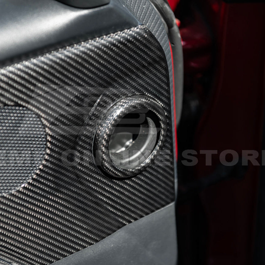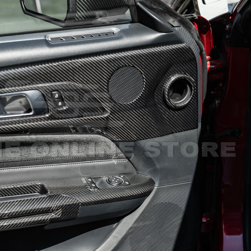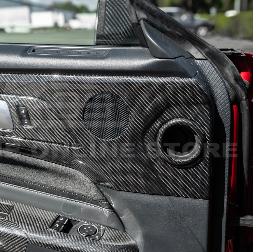 Upgrade the interior door panel aesthetics of your 2024–Present Ford Mustang S650 with the 2024-2026 Ford Mustang S650 Dry Carbon Fiber Interior Door Speaker Cover. These precision-cut trim covers replace the factory speaker surrounds with a premium dry pre-preg carbon fiber finish that adds a motorsport-inspired touch to your cabin.