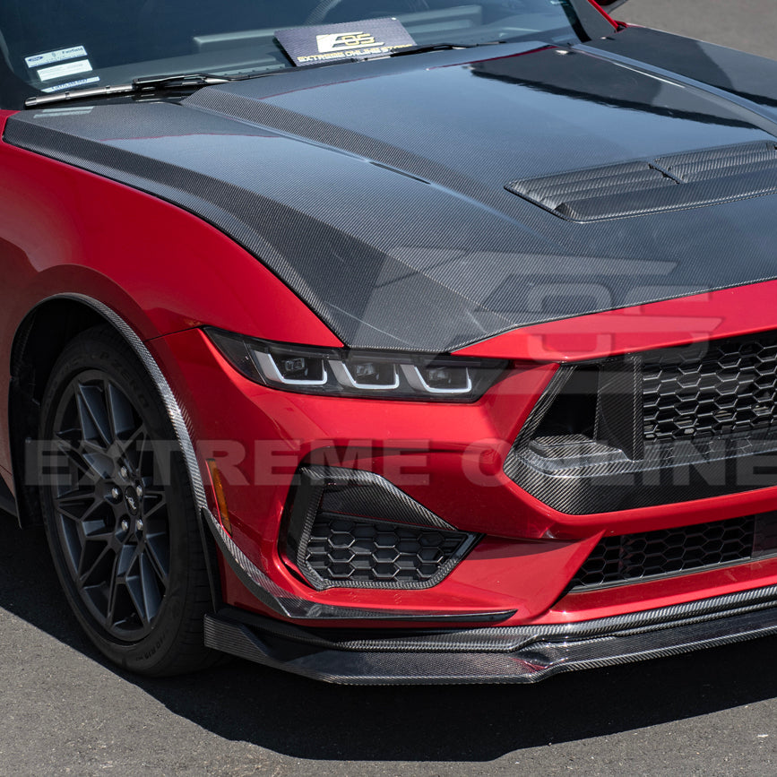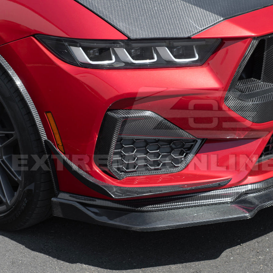 Enhance the aggressive styling and aerodynamic performance of your 2024–Present Ford Mustang S650 GT with the EOS Performance Package Carbon Fiber Front Bumper Side Canard Drive Plane Set. Designed specifically for Mustang GT and GT Premium models, these high-performance add-ons provide both functional downforce benefits and a bold, track-inspired aesthetic that perfectly complements the S650’s muscular design.