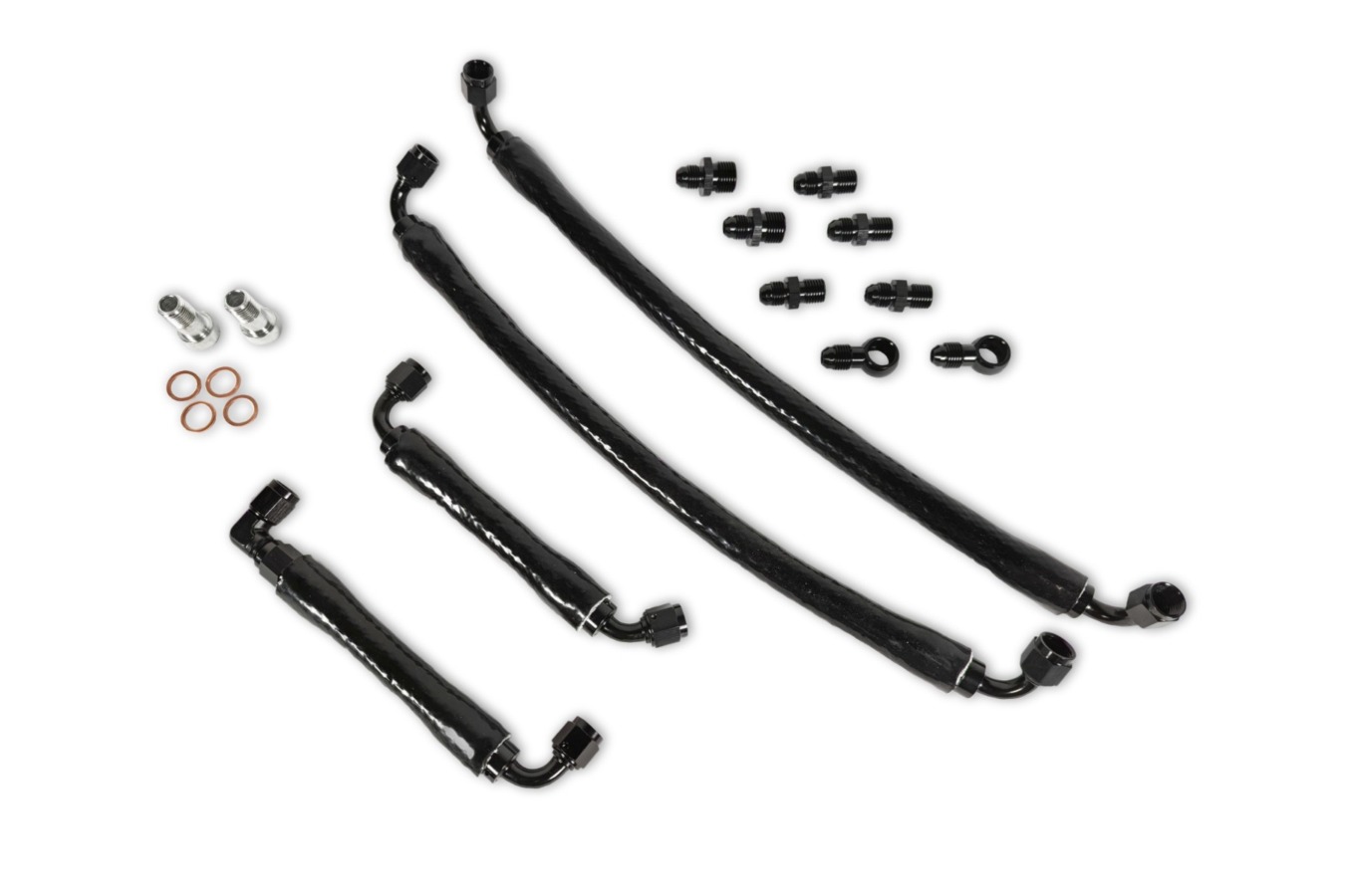 Full-Race 2011-2016 Ford F-150 Turbocharger Coolant Line Upgrade KitIntroducing the Full-Race Turbocharger Coolant Line Upgrade Kit for the 2011-2016 F-150 EcoBoost and compatible models. Engineered to solve the notorious issue of leaky turbocharger coolant lines, this kit replaces the problematic OEM “Jiffy Tite” o-ring fittings with robust Army Navy (“AN”) fittings, ensuring permanent, leak-free performance. Constructed with braided stainless hoses and military-grade billet CNC machined fittings, this kit offers superior resistance to oxidation, weather, and heat cycling, as well as exceptional high-pressure durability, ensuring your engine remains cool and performs optimally, even in extreme conditions.