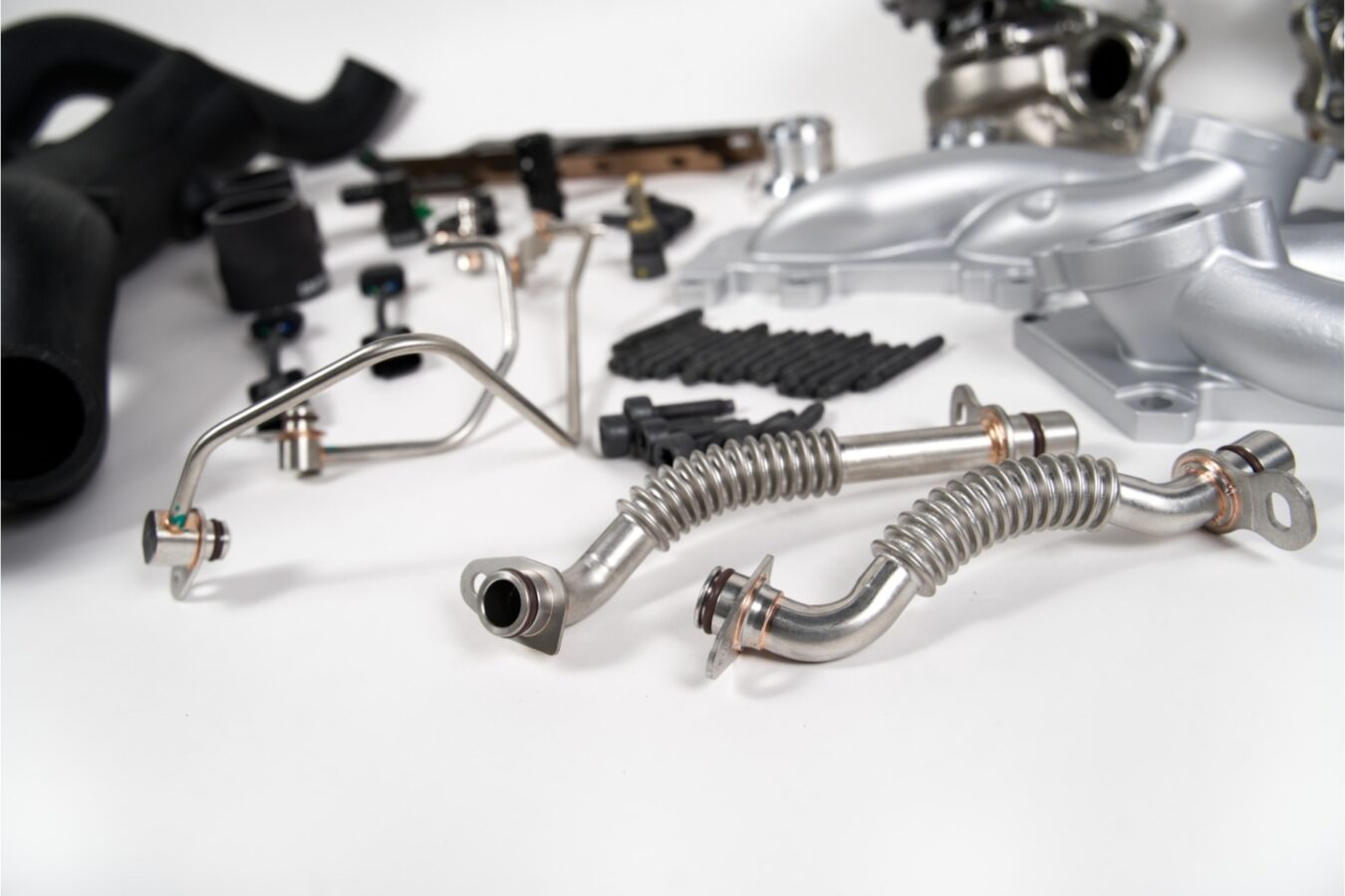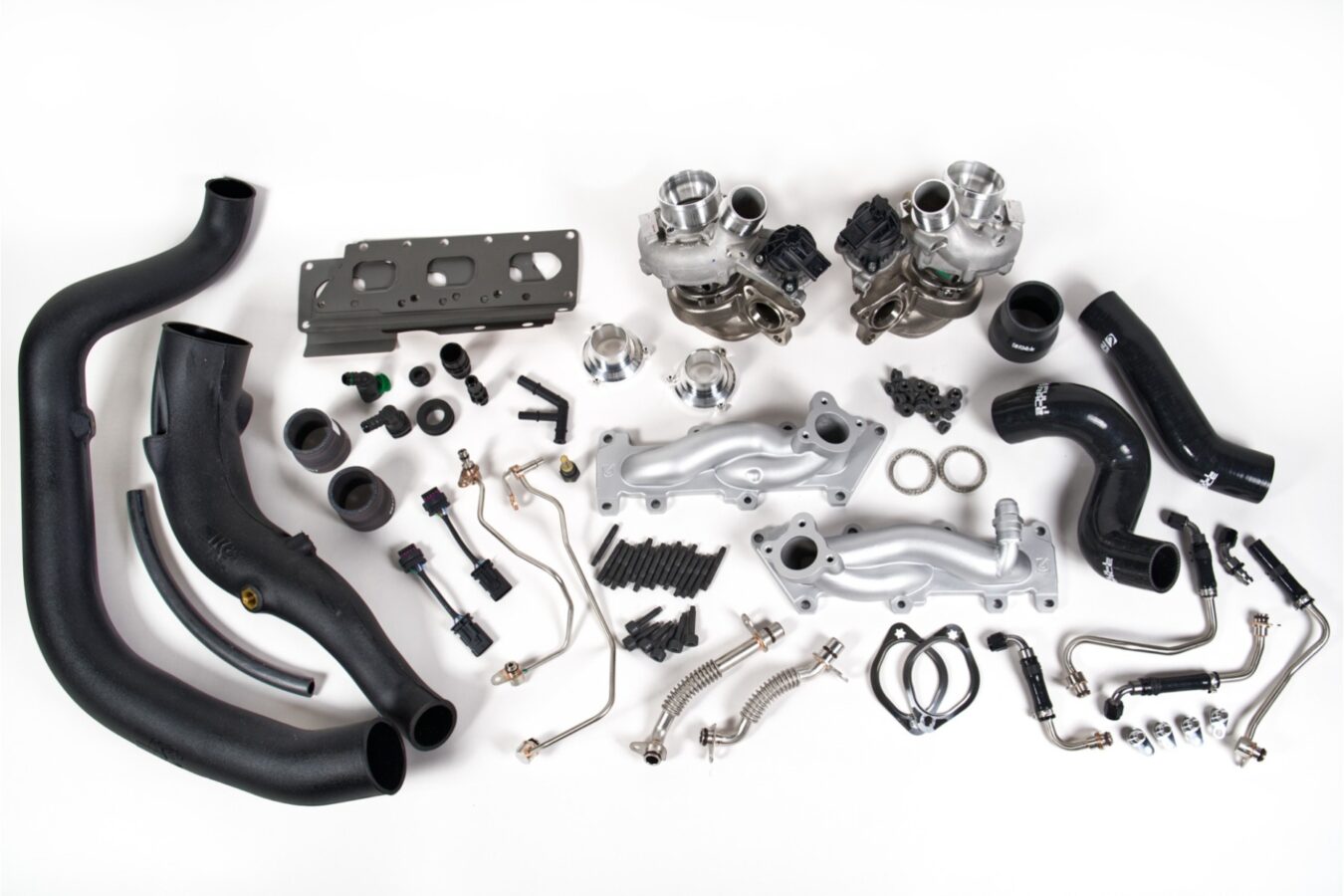 Custom SPD catted downpipes, K&N high-flow turbo inlets, upgraded AN-style coolant lines, and all necessary hardware, couplers, and seals. Every component was designed to integrate seamlessly, eliminating the need for custom fab or guesswork.
