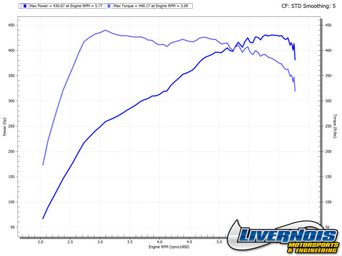 The Livernois MyCalibrator tuner offers multiple levels of improved tuning, with the 93-octane performance tune leading the way in performance. This tune suits peak vs. peak gains of over 75WHP and 80WTQ.