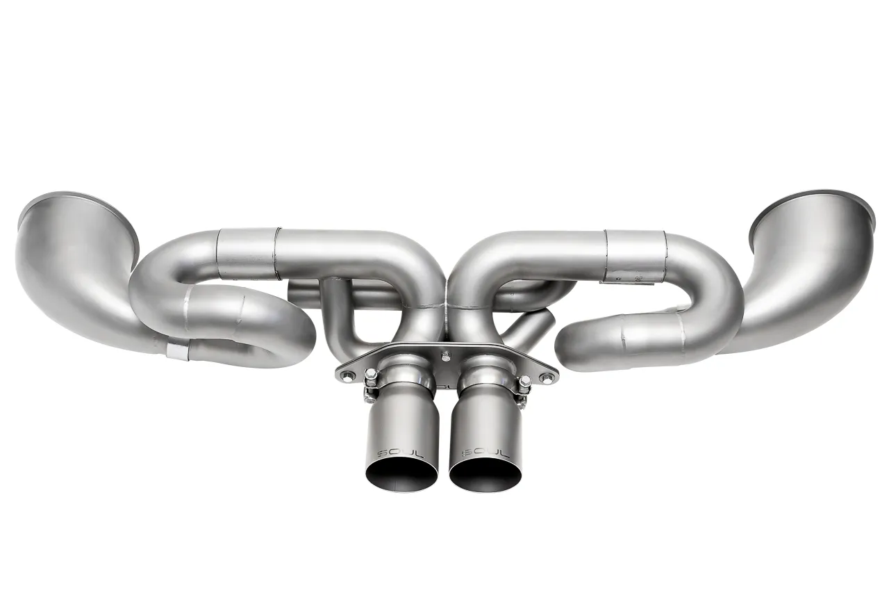 SOUL’s Performance Exhaust offers a transformational sound experience by forgoing the factory valve programming and replacing the rear muffler with a bespoke x-pipe design. By routing exhaust from the factory headers into unique cast cones, through 3″ tubing to the x-pipe and out the 4″ tips, the full complement of sound from the 4.0-liter flat-six is available at any point in the rev range.
