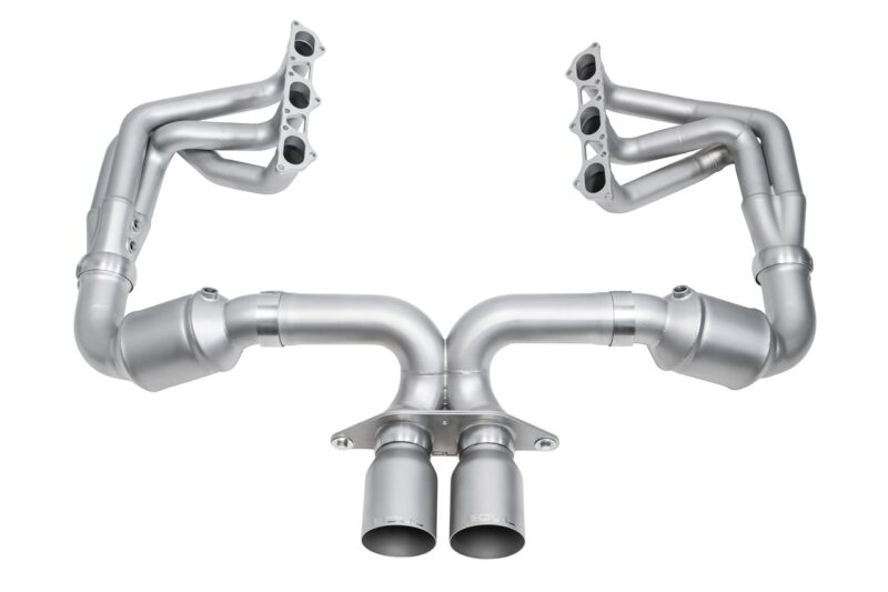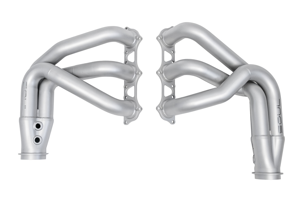 Even a premier engineering masterpiece like the GT3 comes from Porsche fitted with exhaust manifolds restricted in terms of primary tubing length, runner diameter, and merge collection efficiency due to dense catalytic converters, mass production, and emission restriction compromises. By refining the interface between the flange/primary tubes, using smooth radius large diameter bends, and implementing performance-oriented collectors with merge spikes, Soul has achieved increased flow, response, and performance with a more aggressive exhaust note to match.