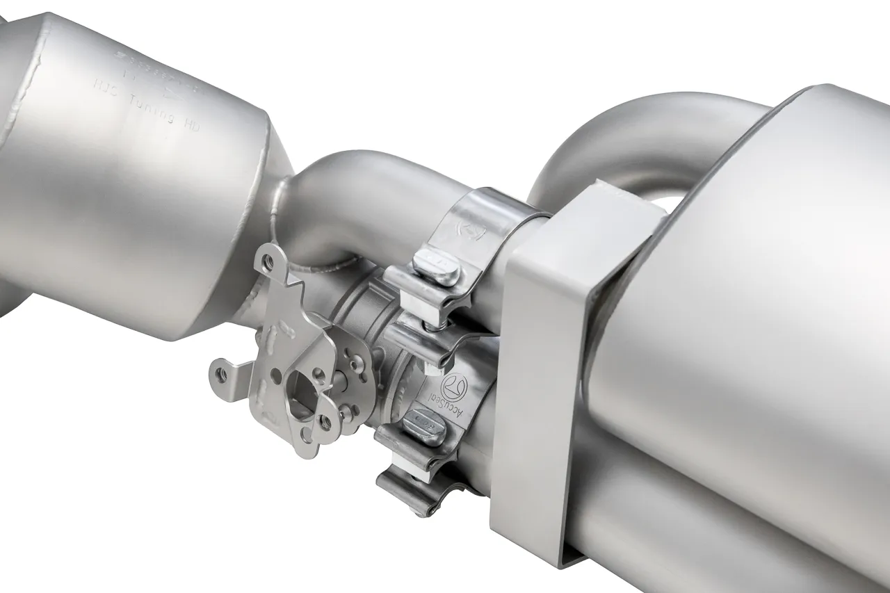 Complete header and valved exhaust package with controllable sound. Long tube headers with CNC merge collectors feed a bespoke X-chamber muffler with electronic valve control—aggressive on demand, civilized when needed.