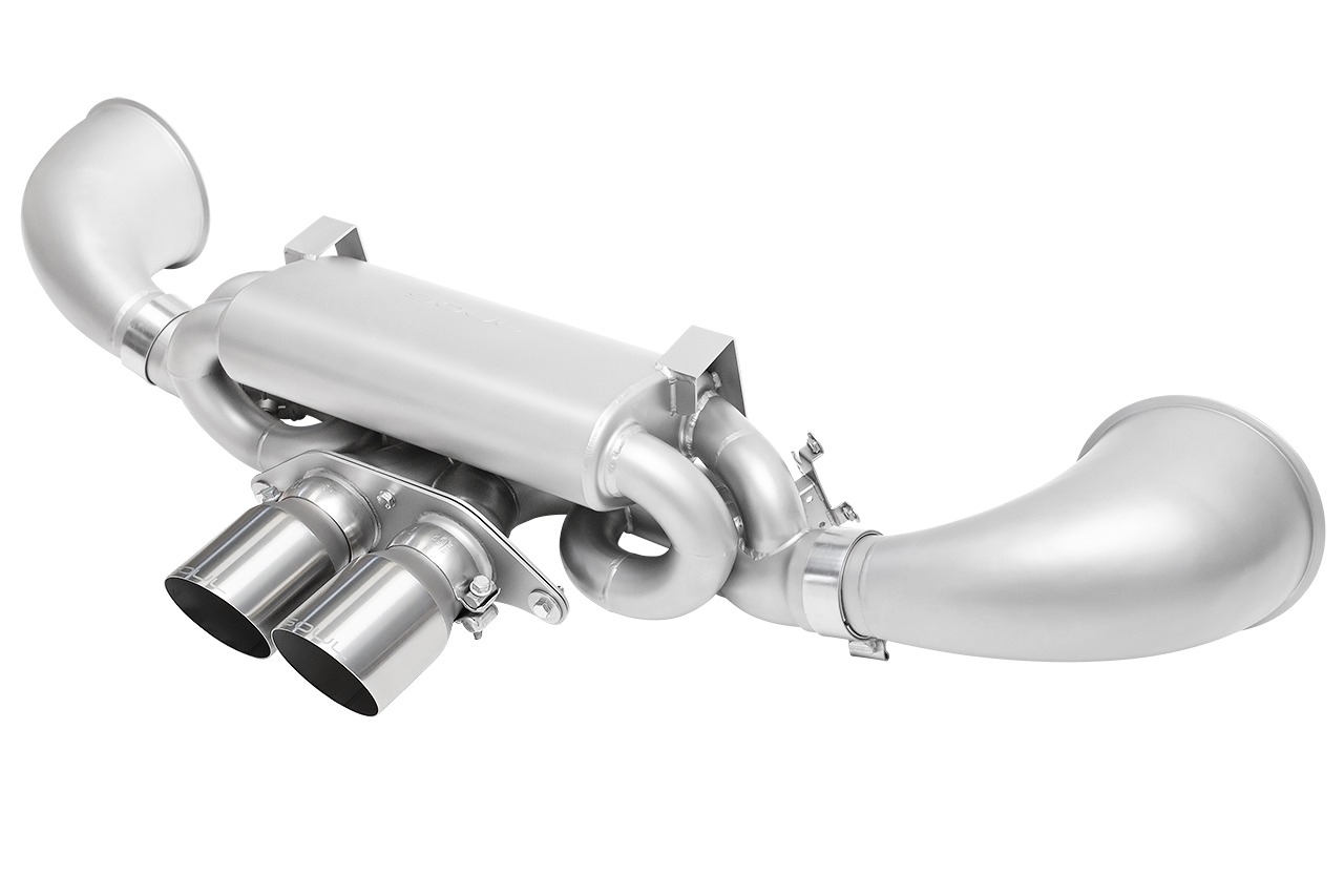 This system was designed to offer a more desirable sound experience with tone enhancement under all conditions. Enjoy more presence during casual driving and an aggressive wail summoned by your right foot. The blending of banks from the X-pipes combined with the sound attenuating features of the muffler gives the car a higher pitched sound befitting of a GT car with a respectable increase in mechanical tone and aggression.