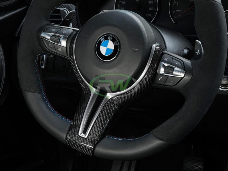 Upgrade the interior appeal of your F Chassis BMW M with RW’s Carbon Fiber Outer Steering Wheel Trim. This steering wheel trim is constructed using a durable ABS plastic material, and overlayed using 100% genuine 2×2 carbon fiber fabric which is finished with a high quality clear coat to ensure it’s longevity for years to come. This steering wheel trim will fit all F Chassis BMW M models including the F87 M2, F80 M4, F82/F83 M4, F10 M5 LCI, F06/F12/F13 M6, F85 X5M, and F86 X6M. Each trim piece is meticulously inspected to ensure you receive a perfect product. This is a replacement style product, so it completely replaces the existing black trim currently on your vehicle.