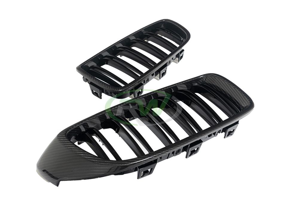 RW Carbon brings you another sweet carbon fiber offering for your F32, F33, F36, F80, F82, or F83. These carbon fiber grilles feature the desirable double slat design with the outer portion of the kidney grille being finished in genuine carbon fiber. Recently we have upgrade the way in which these carbon fiber grilles are crafted. The carbon fiber grilles feature a pre-preg outer carbon fiber ring that is installed on a base plastic grille. Manufacturing the grilles like this we were able to vastly improve the life of the grilles, as well as provide an improved visual appearance as the pre-preg carbon fiber have more of a carbon fiber “pop” to them. Our carbon fiber grilles feature 2×2 Carbon Fiber weave that will nicely match any other RW or OEM Carbon Fiber parts you have installed on the vehicle. Only use the best carbon fiber items on your BMW 4 series or M3/M4 and opt for the RW Carbon Carbon Fiber replacement grilles. NOTE: This item is sold in pairs.
