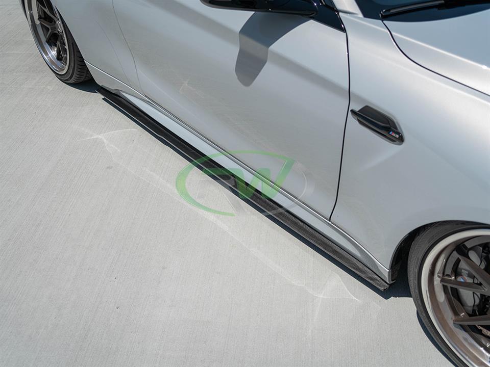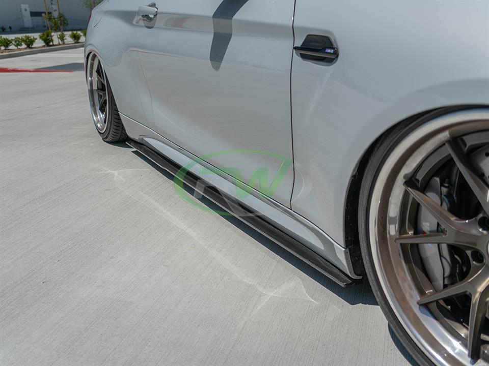 Improve the curb appeal of your BMW F87 M2 or M2 Competition with our RW Signature side skirt extensions. These side skirts are designed in-house at RW and offer a look that is unlike anything else on the market. These side skirts are right in the middle of sporty and stylish without being too aggressive that you lose ground clearance or your passengers step on them. These RWS Carbon Fiber Side Skirt Extensions are a must have addition to your BMW F87 M2 or M2 Competition to complete your RW Carbon fiber ground effects package. Our products are made from a genuine 2×2 carbon fiber weave and can be custom ordered to be 1×1 weave or forged carbon. As always, these pieces are backed by our fitment and quality guarantee to ensure you are getting a quality product. They will iinstall using self-tapping screws, which are included with purchase.