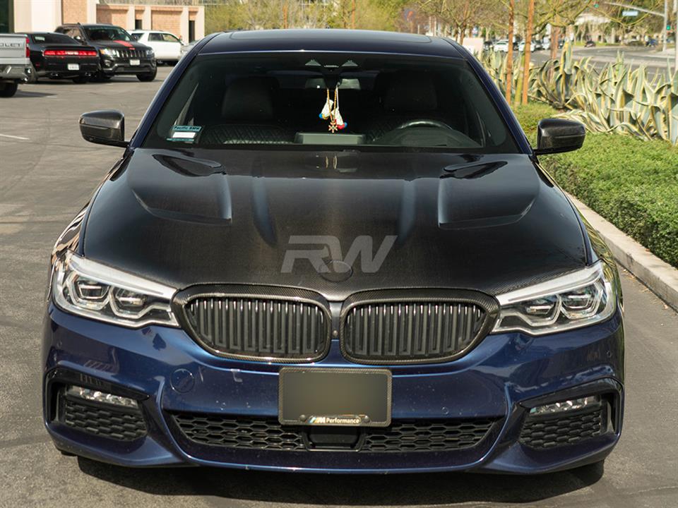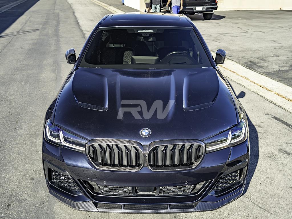Come take a look at this CS style carbon fiber hood for your 2018+ F90 M5 (LCI and Competition) and G30 5-Series. This Carbon Fiber hood offers less weight and a more aggressive appearance over your factory hood. This product is bolt-on which requires no special modifications to your BMW, but it will likely need adjusting to get the correct fit. Each CS style hood is crafted from genuine carbon fiber that will perfectly match the look of any RW or OEM part you have installed on your BMW. Like all of our parts, each hood comes backed with RW Carbon’s superior fitment and quality guarantee to ensure you rock a piece you can be proud of. Our hoods come with studs built into the hood unlike some other options on the market which do not mount like OEM.