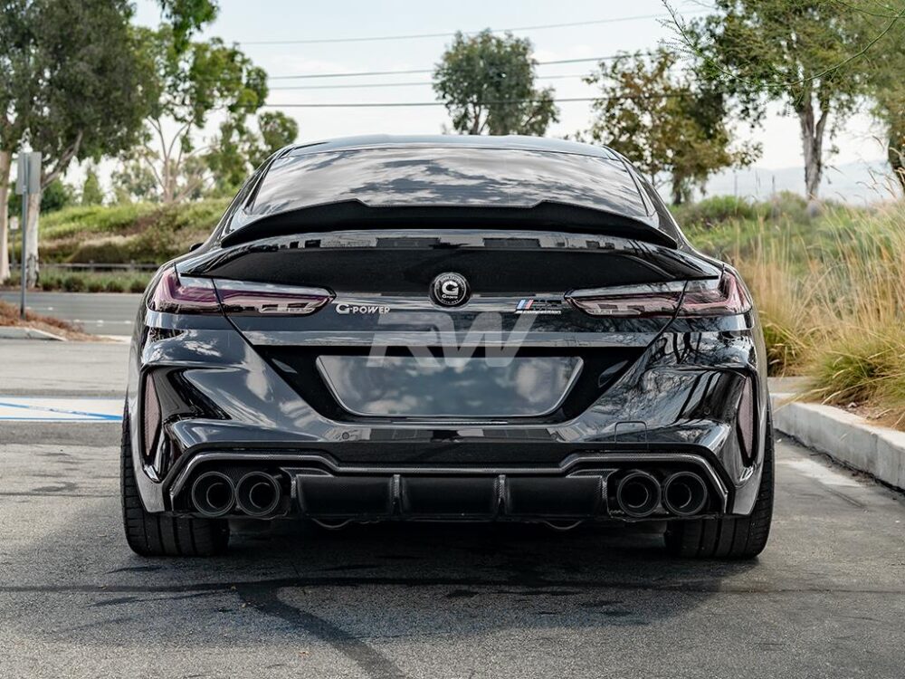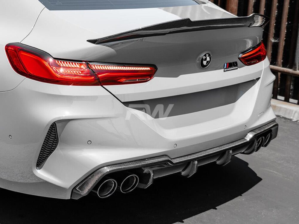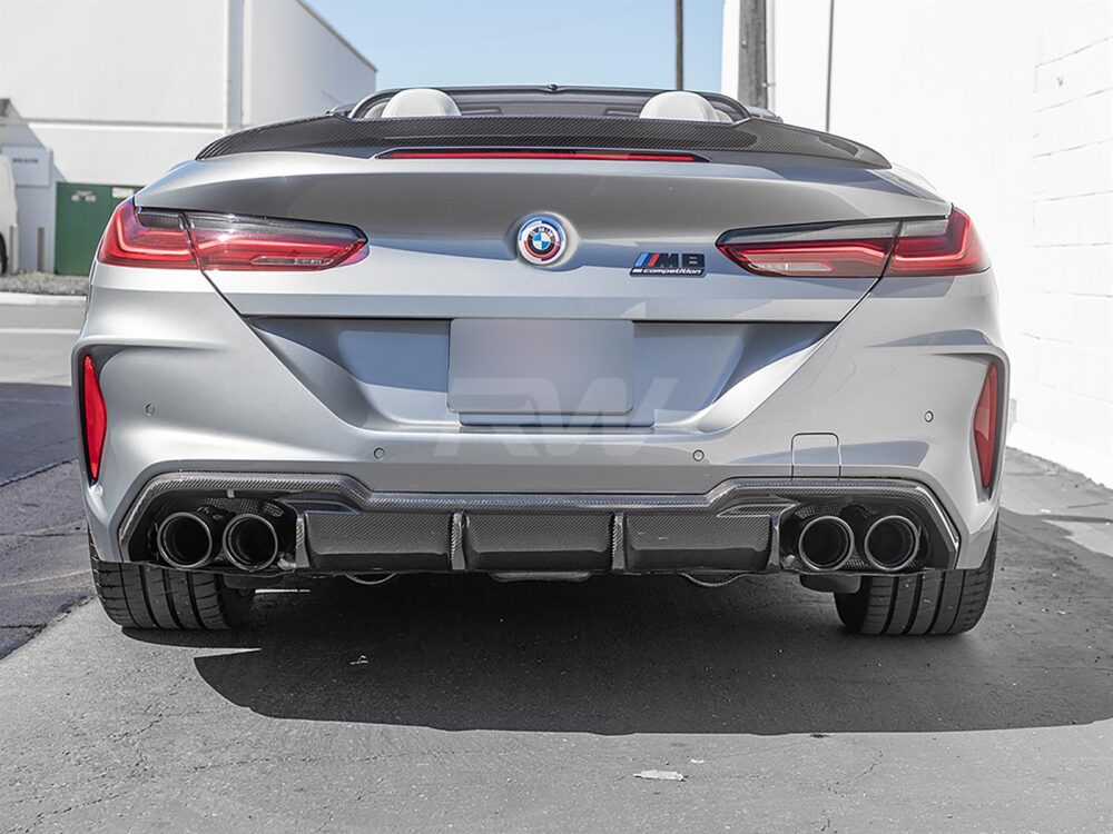 Reach new heights with this RW Carbon DTM Carbon Fiber Rear Diffuser for the BMW M8. This beautifully hand crafted diffuser has sporty styling cues that will turn heads at your next car show or traveling through town. Our DTM Carbon Fiber Diffuser fits all 2019+ BMW M8 applications, including the coupe, gran coupe and convertible. We construct this diffuser using genuine carbon fiber that is then completed with a clear coat to promote shine and UV protection for longevity. These diffusers will replace your OEM or factory diffuser and will attach using the same mounting locations. Each one is then quality checked one last time before being packages and shipped to your doorstep. If you have any questions, please reach out to one of our Carbon Fiber experts today.