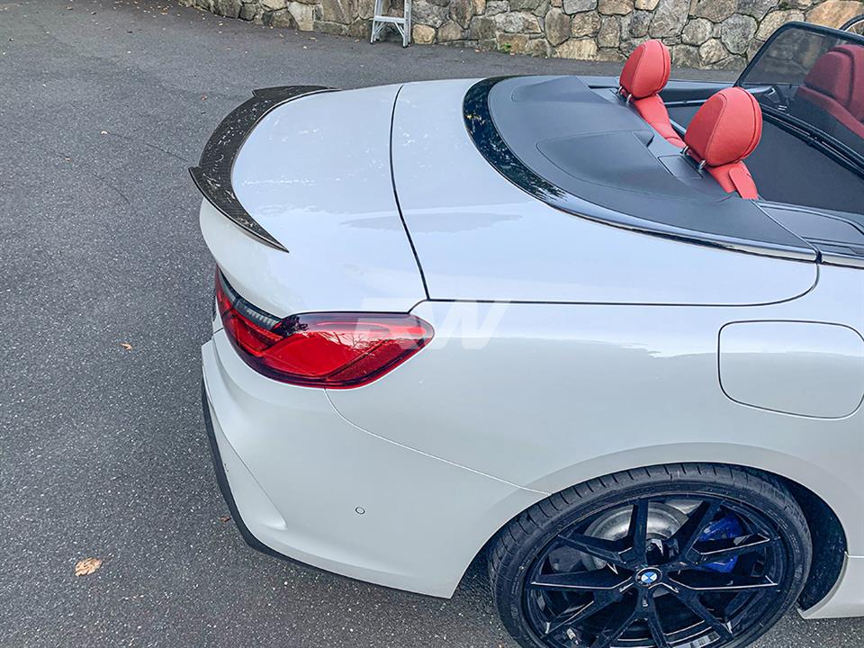 Top down or top up; achieve greater style for your 8 series or M8 with our DTM carbon fiber rear trunk spoiler. This trunk spoiler fits all 2020+ F91 M8 Convertible and 2019+ G14 8 series convertible models. Featuring carefully crafted 100% carbon fiber construction and excellent fitment, you can’t go wrong with this exterior styling upgrade for your cars rear. Each BMW G14 DTM Style Full Carbon Fiber Trunk Spoiler features simple installation that doesn’t require any holes into your trunk, simply by using our double sided tape. Whether your G14’s first exterior mod or the last, this DTM Full Carbon Fiber Trunk Spoiler is always a fantastic choice.
