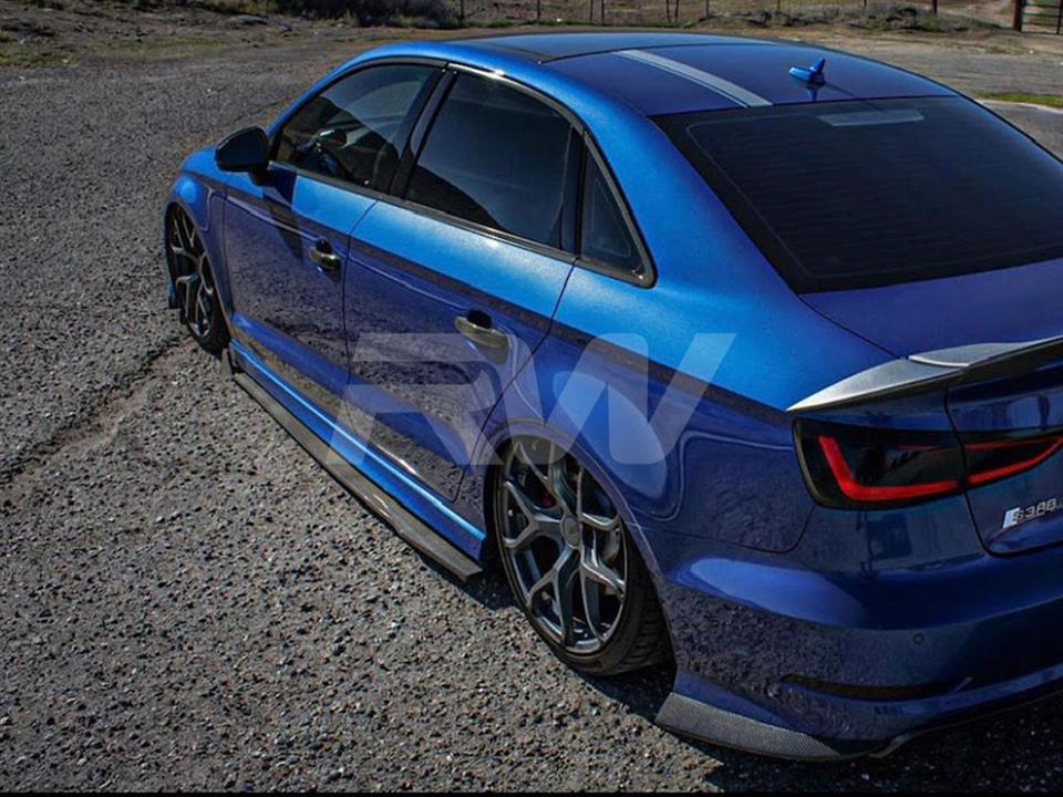Enhance the side profile of your 2020-2024 Audi A3 with these carbon fiber Side Skirt Extensions from RW Carbon. Designed to seamlessly integrate with the factory rocker panels, these extensions create a lower, more aggressive stance. Constructed from premium carbon fiber with a high-gloss clear coat finish.
