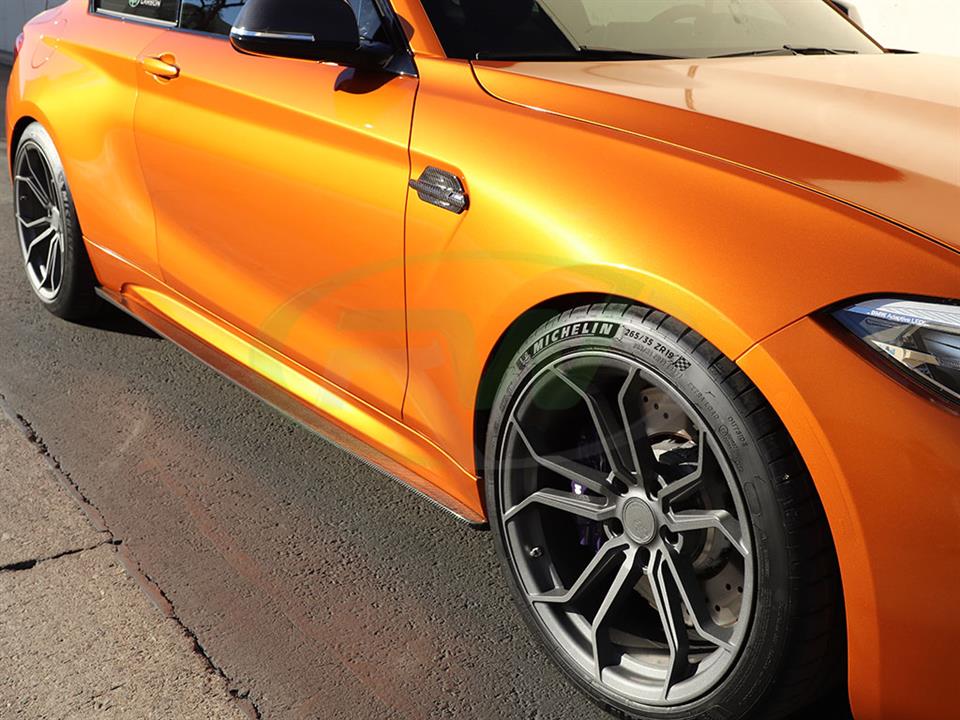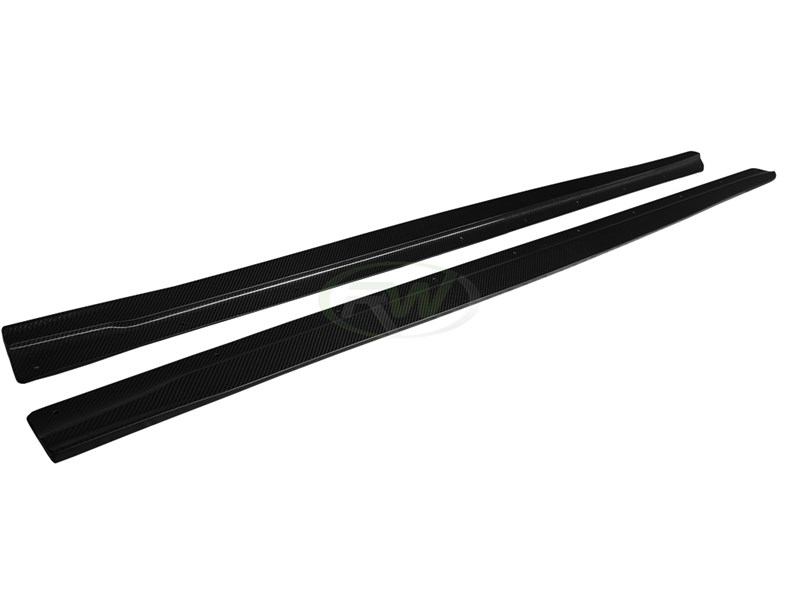 Enhance the side profile of your 2020-2024 BMW F87 with these carbon fiber Side Skirt Extensions from RW Carbon. Designed to seamlessly integrate with the factory rocker panels, these extensions create a lower, more aggressive stance. Constructed from premium carbon fiber with a high-gloss clear coat finish.