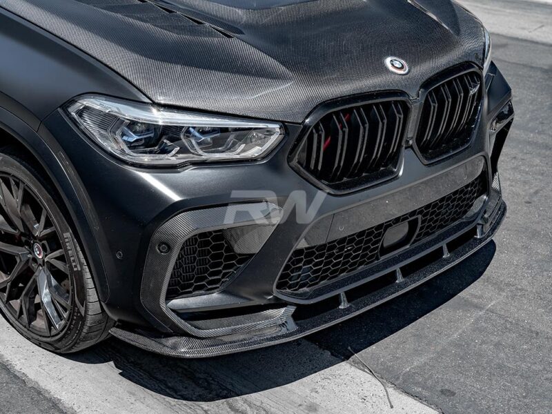 Do you want to upgrade the look of your BMW F96 X6M to something that will make your car turn heads up and down the road? The BMW F96 X6M RWS Carbon Fiber Front Spoiler is the piece you need to truly distinguish yourself on the road. Our RWS or RW Signatures front lip is designed in-house at RW Carbon and ensures a style that is unique to anything else on the market. It is big, bold and aggressive just like your 2020-2023 BMW F96 X6M. It’s hand-crafted using 100% carbon fiber in a 2×2 weave pattern so it will match all of our other F96 X6M parts. This F96 X6M front lip spoiler is also clear coated to add protection against the elements and give it that car show-like shine and shimmer. This front lip is aesthetically pleasing and fully functional, adding down force and aerodynamics to your BMW at higher speeds.
