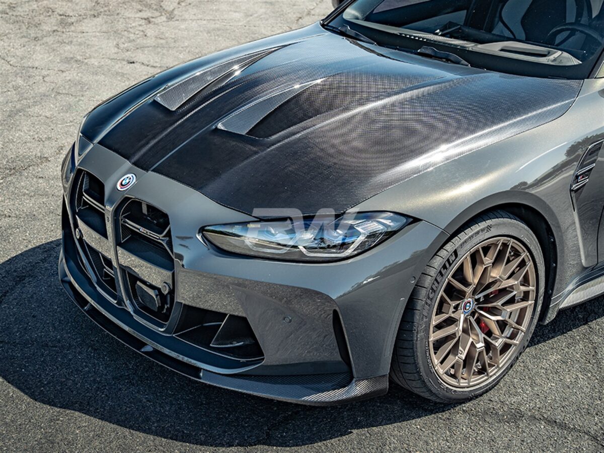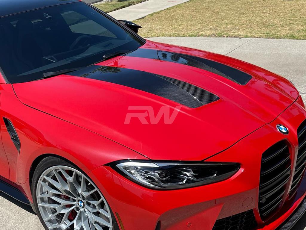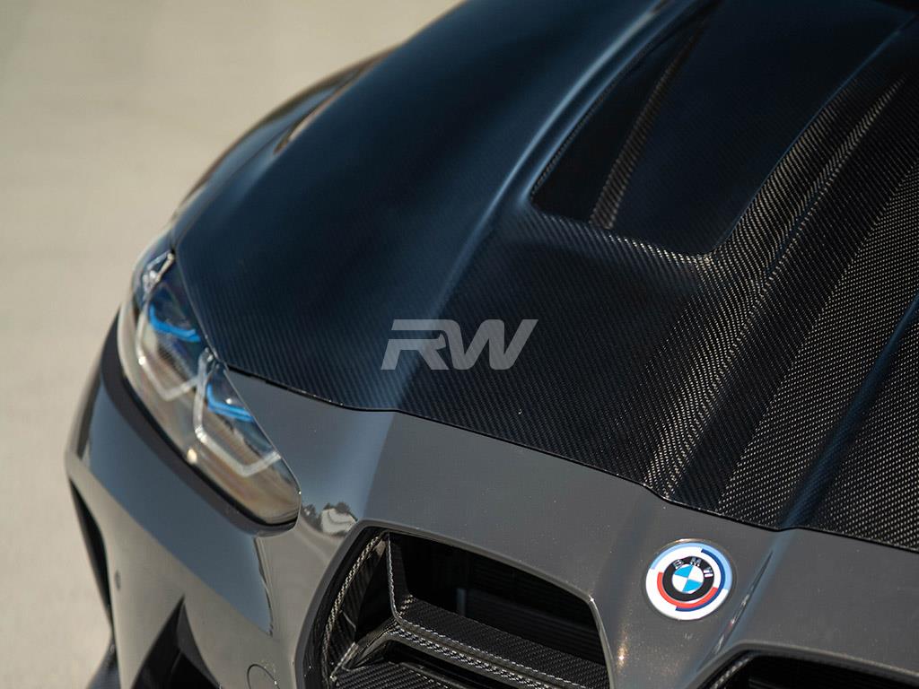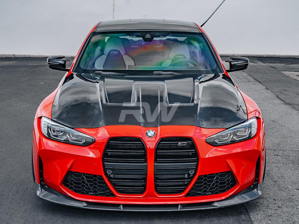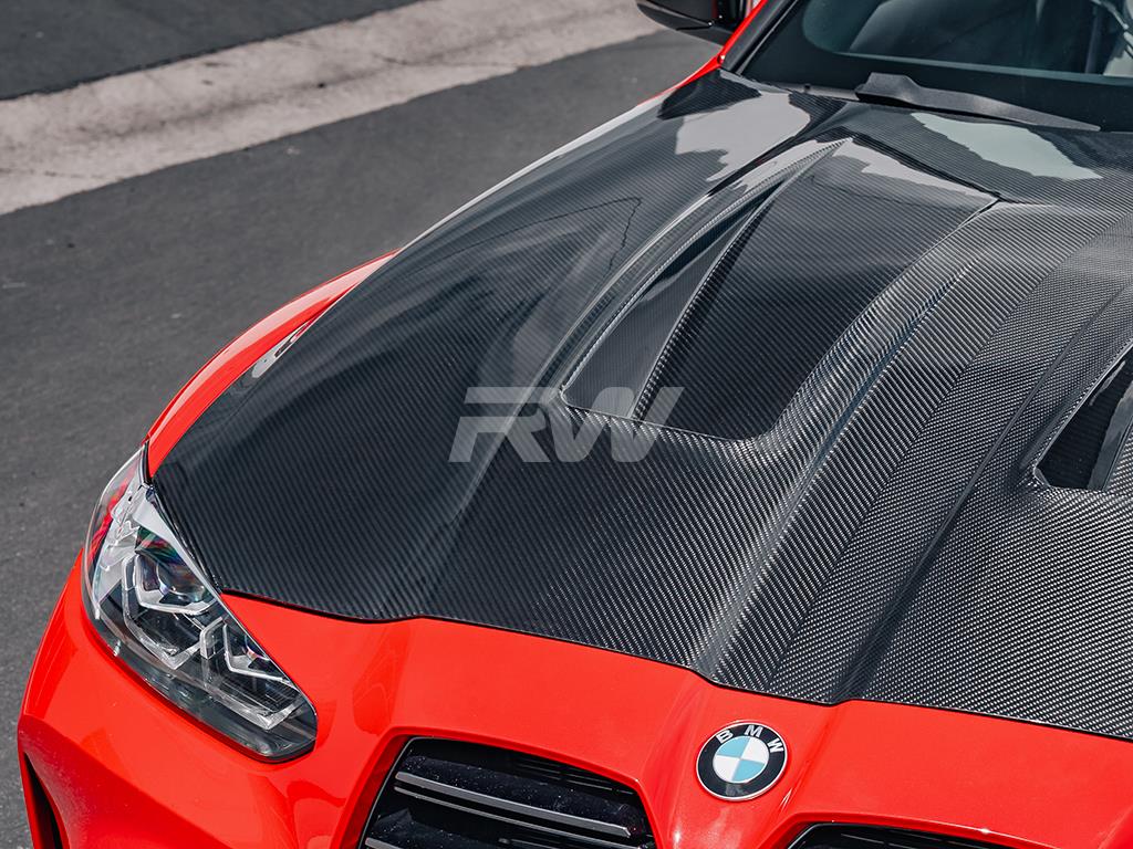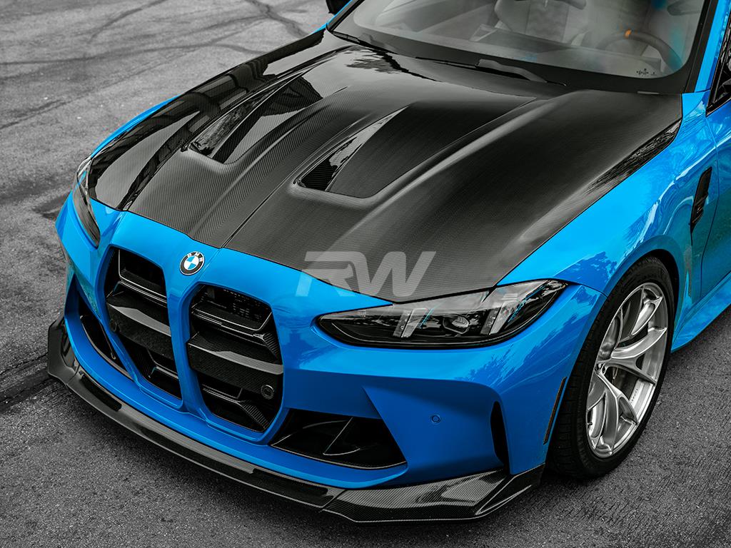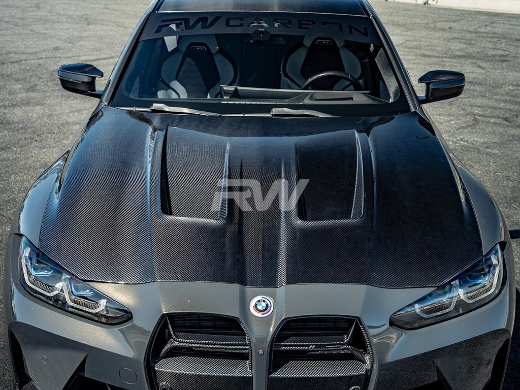 RW Carbon now has a full Dry Carbon Fiber Hood for your new G80 M3 or G82/G83 M4 which offers a much more aggressive styling over the OEM hood! This DTM hood’s installation is bolt-on requiring no special modifications to your BMW. Each hood is crafted from 100% dry carbon fiber that will perfectly match any other RW or OEM parts you have installed on the car. Each hood comes backed with RW Carbon’s superior fitment and quality guarantee that so many M3 & M4 owners have come to love. Our DTM Style hoods come with studs built into the hood to make installation easier. Other than looking increasingly aggressive on your vehicle, this RW hood is 50% lighter than OEM. Elevate your G8X M3 or M4 today with a new carbon fiber DTM hood from RW Carbon!