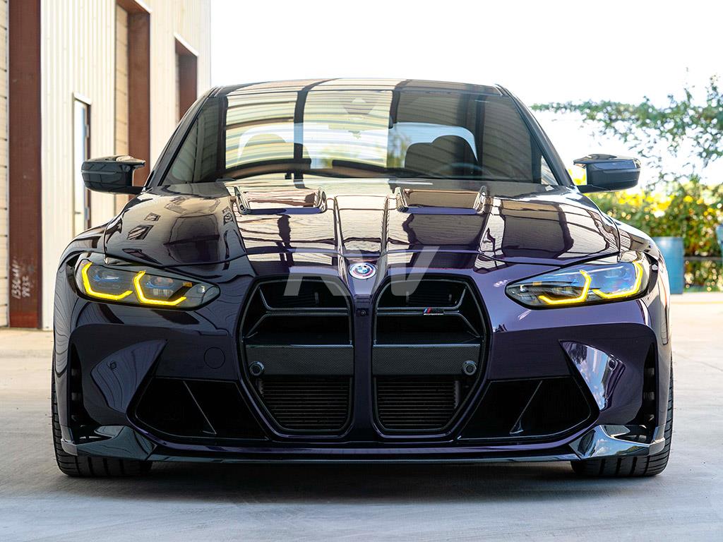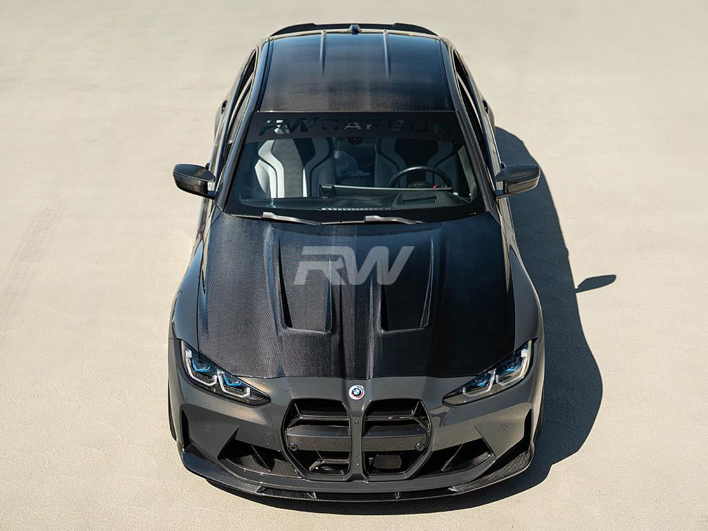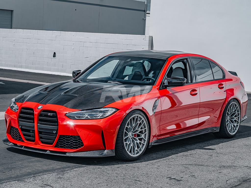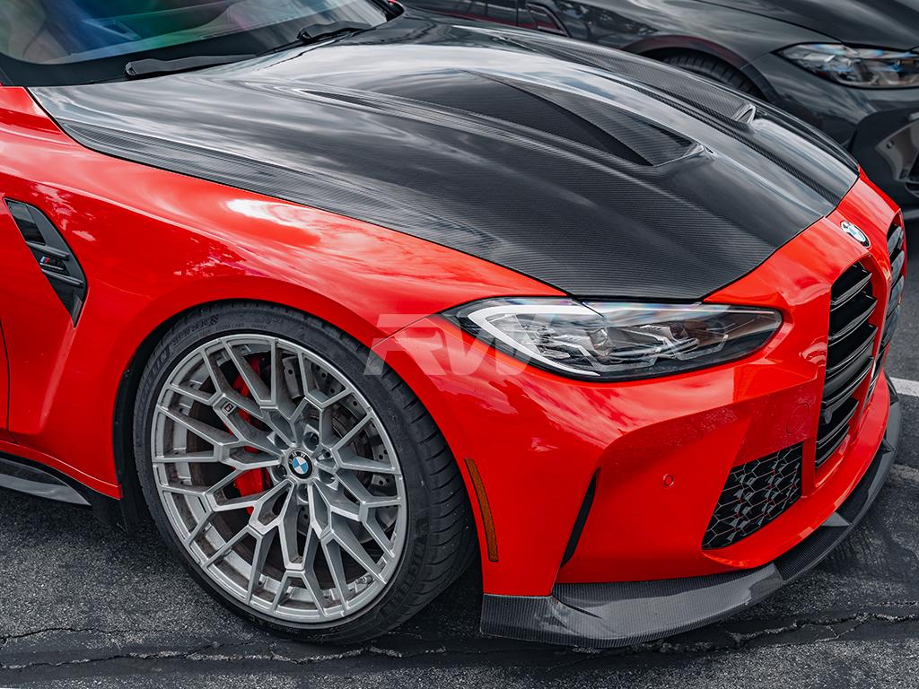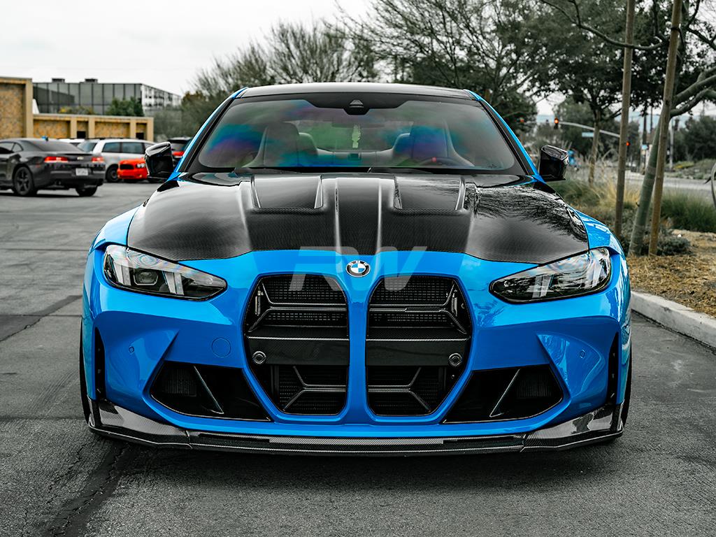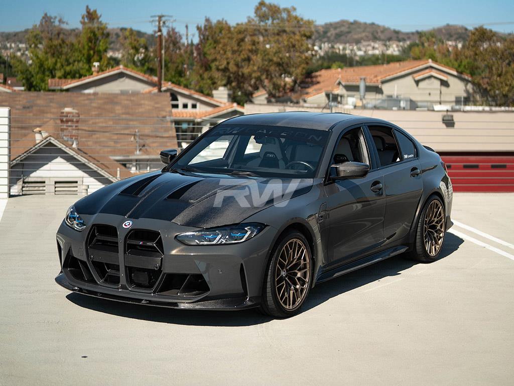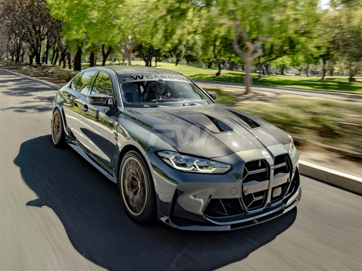 RW Carbon now has a full Dry Carbon Fiber Hood for your new G80 M3 or G82/G83 M4 which offers a much more aggressive styling over the OEM hood! This DTM hood’s installation is bolt-on requiring no special modifications to your BMW. Each hood is crafted from 100% dry carbon fiber that will perfectly match any other RW or OEM parts you have installed on the car. Each hood comes backed with RW Carbon’s superior fitment and quality guarantee that so many M3 & M4 owners have come to love. Our DTM Style hoods come with studs built into the hood to make installation easier. Other than looking increasingly aggressive on your vehicle, this RW hood is 50% lighter than OEM. Elevate your G8X M3 or M4 today with a new carbon fiber DTM hood from RW Carbon!