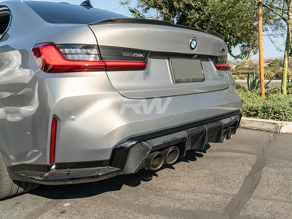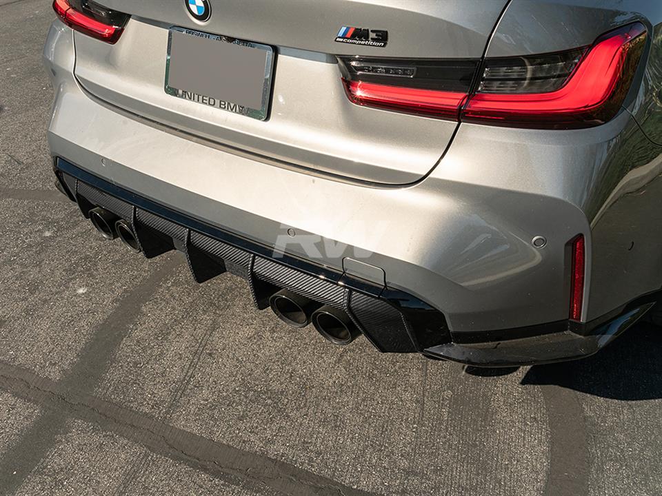 This BMW G80 M3 and G82 G83 M4 Type 2 Carbon Fiber Center Diffuser offers a great visual upgrade for your M3 or M4. Our new rear diffuser features an alternate aggressive design to enhance the rear visual appeal of your vehicle. The G8X M3/M4 Type 2 Full Carbon Fiber Diffuser will seamlessly match other RW or OEM parts you have on the vehicle as we craft them from genuine 2×2 dry carbon fiber. We know our customers care deeply about the parts they choose to install on their vehicle which is why we only use the highest quality carbon fiber fabric, clearcoats, and resin in the making of our products. Just like the rest of our product line this Type 2 carbon fiber diffuser comes with the RW superior fitment and quality guarantee. Installation is purely bolt-on and does not require and special modifications or cutting.