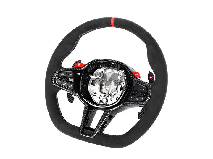 Introducing the BMW G8X LCI Alcantara Carbon Fiber Steering Wheel, designed to elevate your driving experience with its elegant look and feel every time you drive. This steering wheel combines luxurious Alcantara and genuine 2×2 carbon fiber weave, offering a smooth feel and a carbon fiber shine that will complement any other existing carbon fiber interior parts you may have. Upgrade from the common leather grip and feel the difference in your interior. Installation is straightforward, utilizing the OEM steering wheel core, which guarantees proper fitment with every installation. Professional installation is recommended for optimal results. Our steering wheels are specifically made for BMW G8X LCI’s, but if this isn’t the car you own, feel free to explore our wide selection of steering wheel accessories for your BMW model. Contact us today for more information.