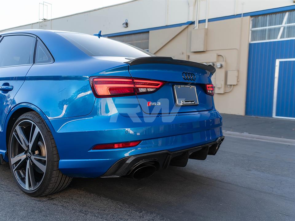 Complete the rear-end transformation of your Audi RS3 with this carbon fiber Rear Diffuser from RW Carbon. This diffuser integrates seamlessly with the factory rear bumper, adding a purposeful, performance-oriented appearance. Crafted from lightweight carbon fiber with a UV-protective clear coat for enduring quality.