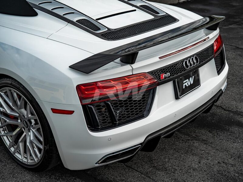 Complete your RW Carbon fiber kit on your Audi R8 4S with a new carbon fiber rear wing. This wing is made using 100% real carbon fiber, making it extremely lightweight and strong. It is designed to improve your supercar’s aerodynamics by adding usable downforce at high speeds. Each and every rear wing is quality checked in house in our Southern California facility prior to shipping it around the world. Each wing is clear coated and polished to match any other RW part that is on your Audi R8. Give your R8 an improved appearance and increased down force with an RW carbon fiber wing today!