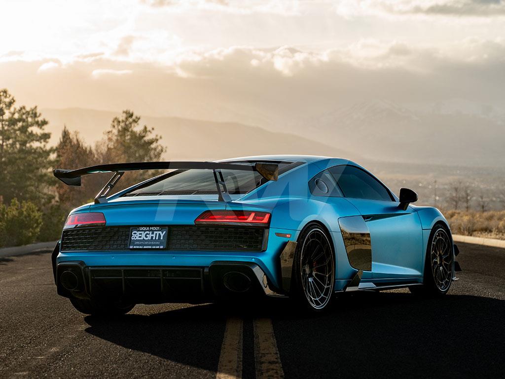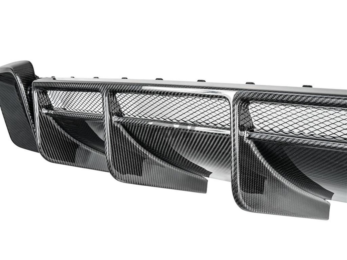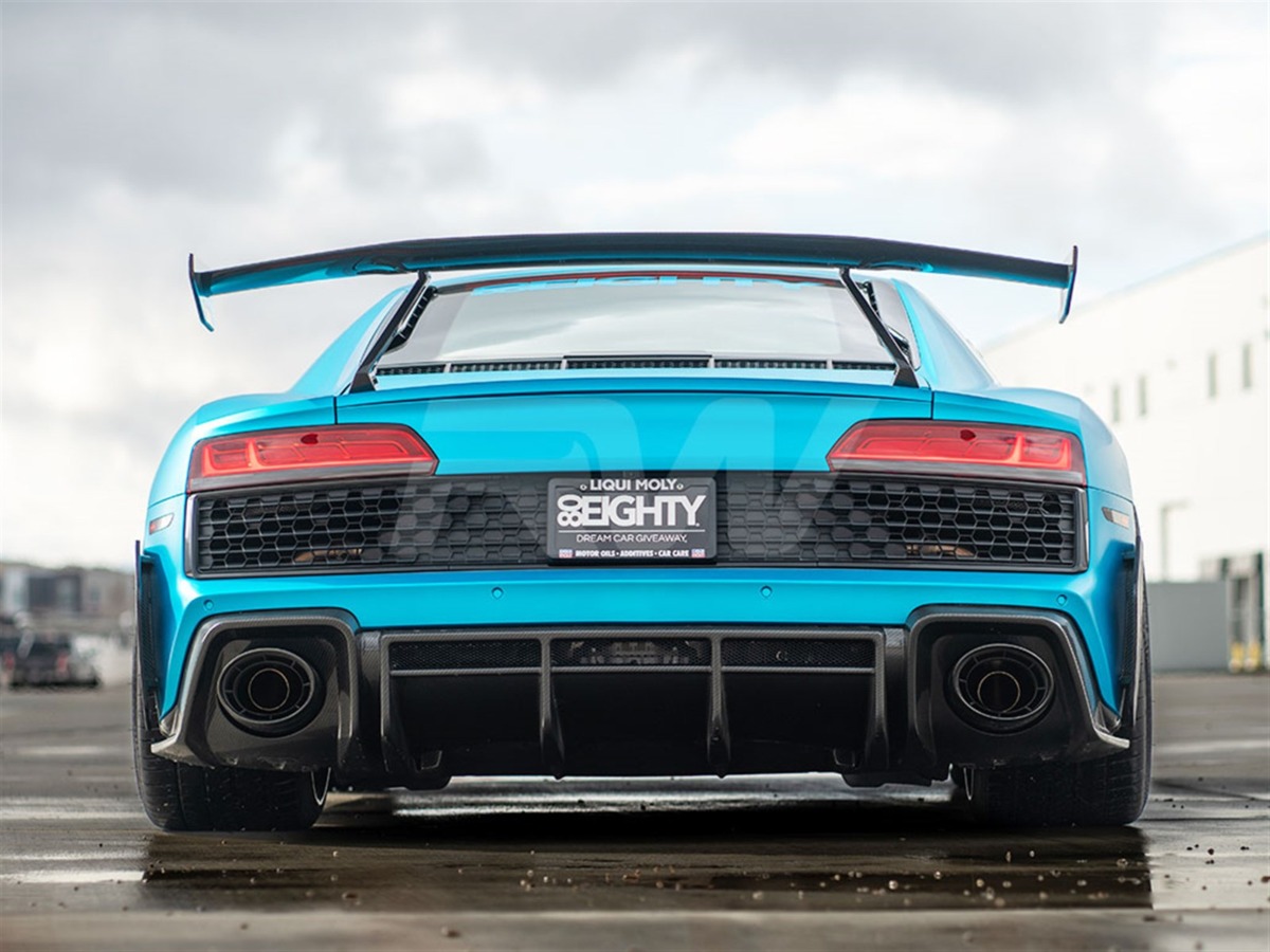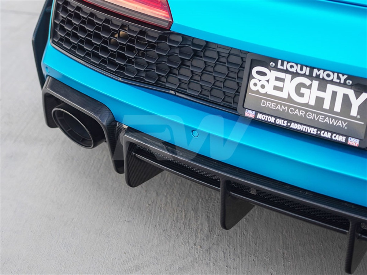 Complete the rear-end transformation of your 2019+ Audi R8 with this carbon fiber Rear Diffuser from RW Carbon. This diffuser integrates seamlessly with the factory rear bumper, adding a purposeful, performance-oriented appearance. Crafted from lightweight carbon fiber with a UV-protective clear coat for enduring quality.