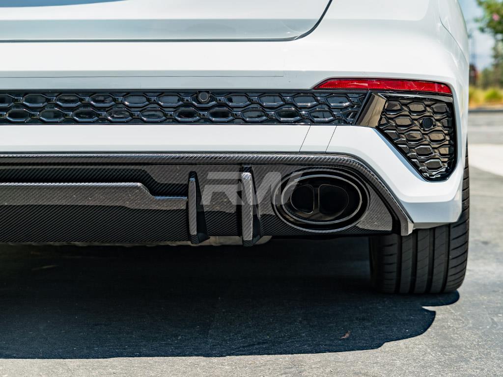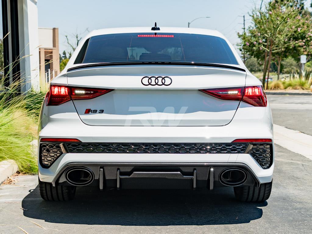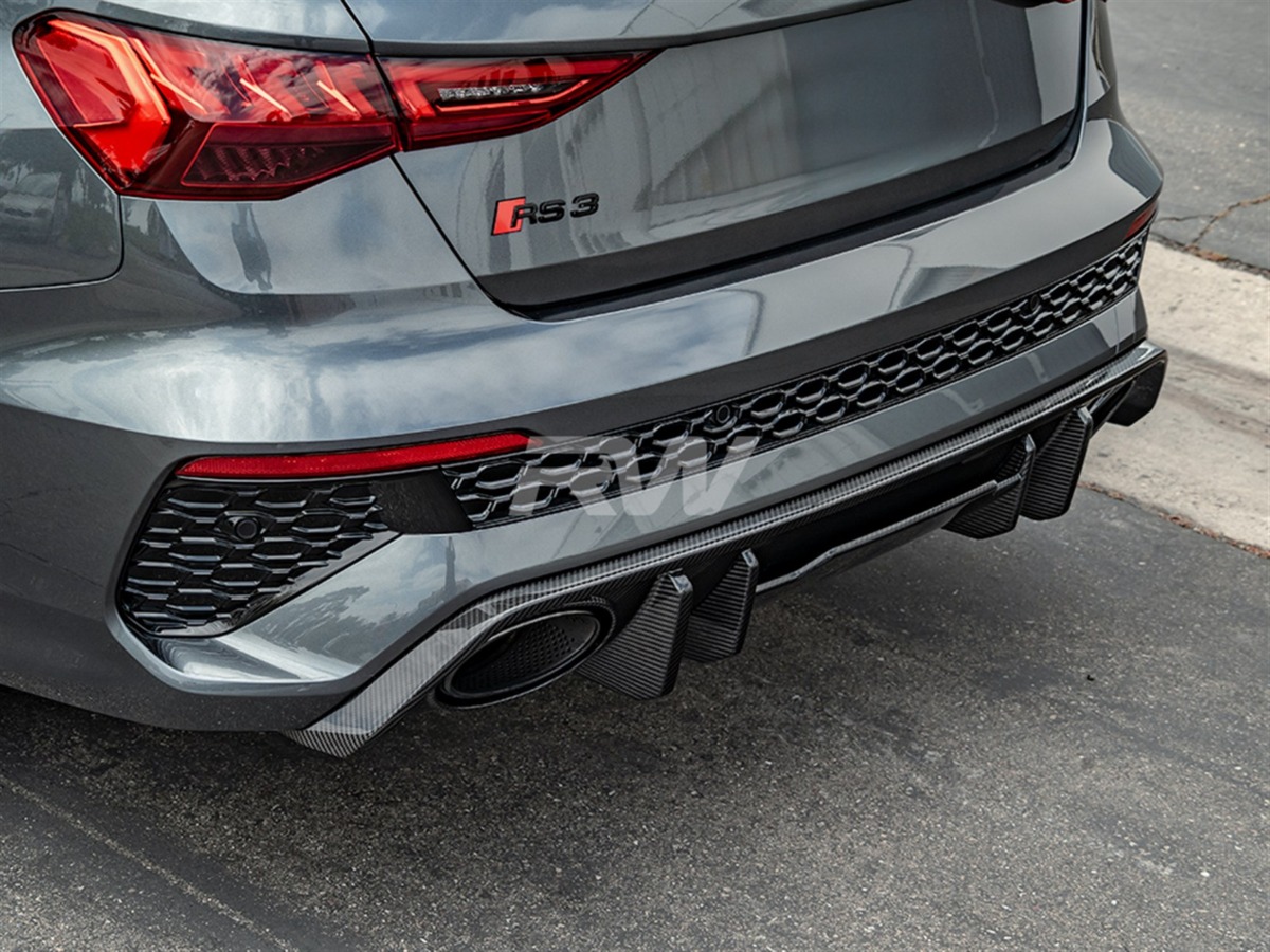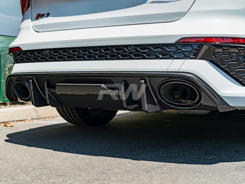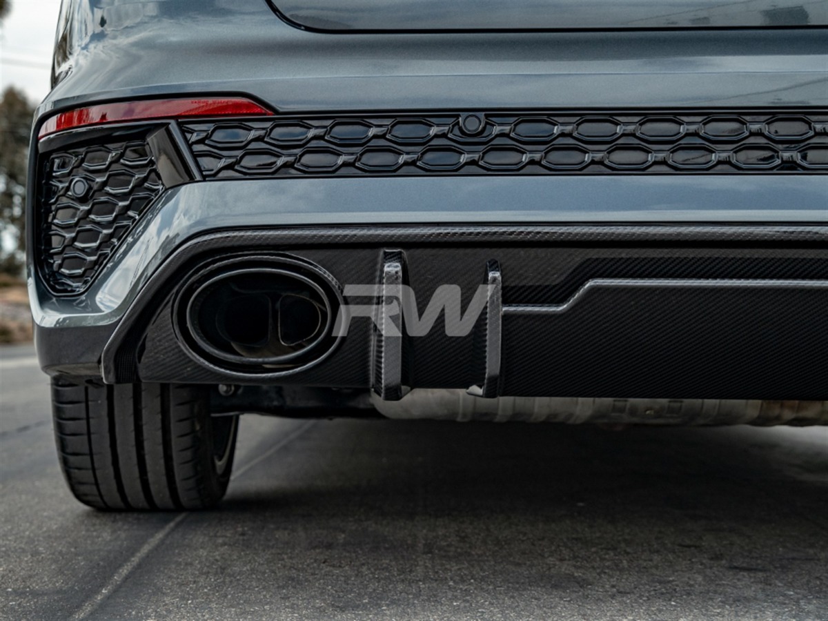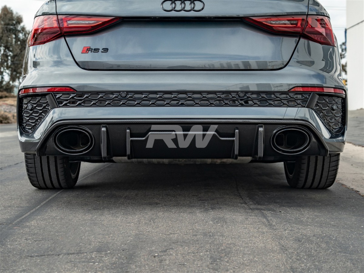 Complete the rear-end transformation of your Audi RS3 with this carbon fiber Rear Diffuser from RW Carbon. This diffuser integrates seamlessly with the factory rear bumper, adding a purposeful, performance-oriented appearance. Crafted from lightweight carbon fiber with a UV-protective clear coat for enduring quality.