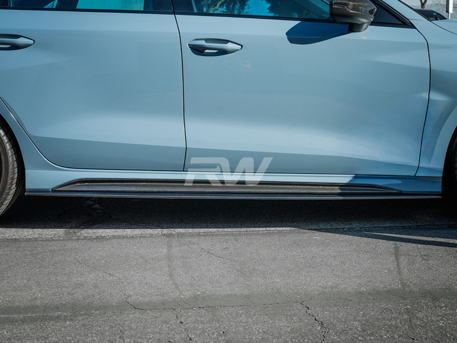 Enhance the side profile of your Audi RS3 with these carbon fiber Side Skirt Extensions from RW Carbon. Designed to seamlessly integrate with the factory rocker panels, these extensions create a lower, more aggressive stance. Constructed from premium carbon fiber with a high-gloss clear coat finish.