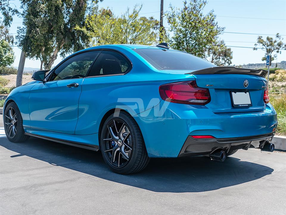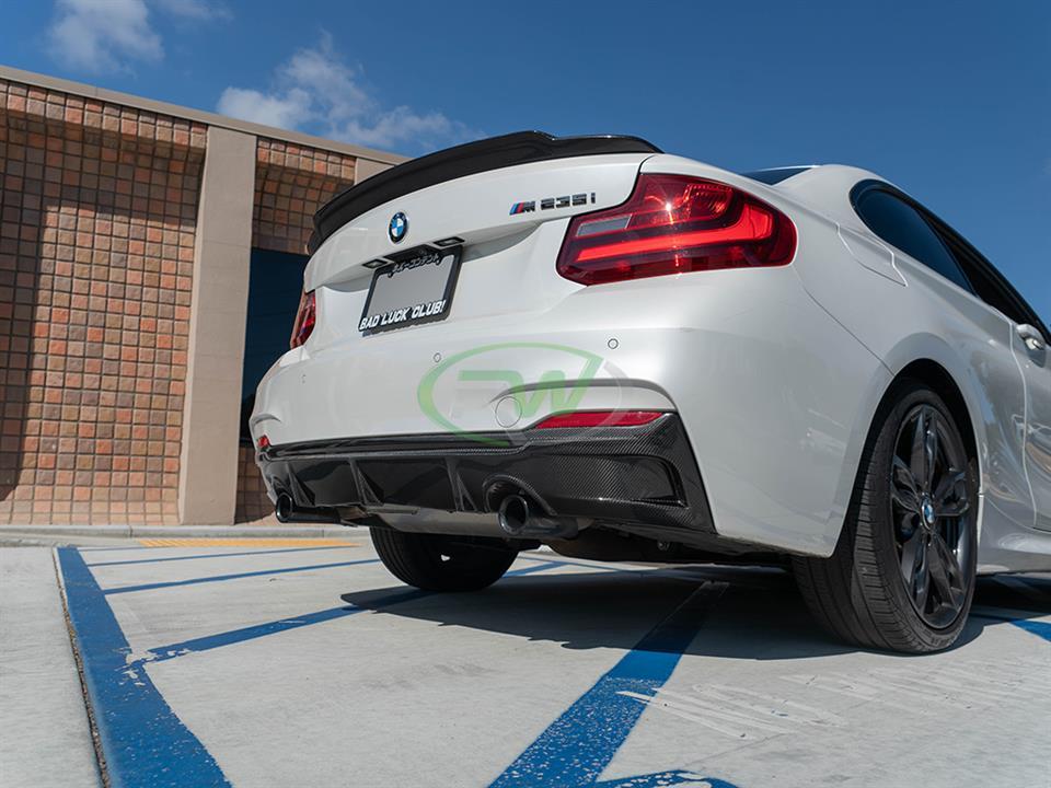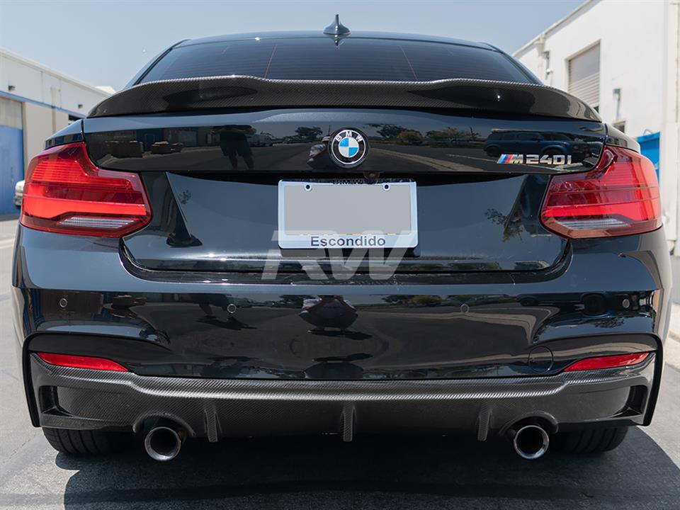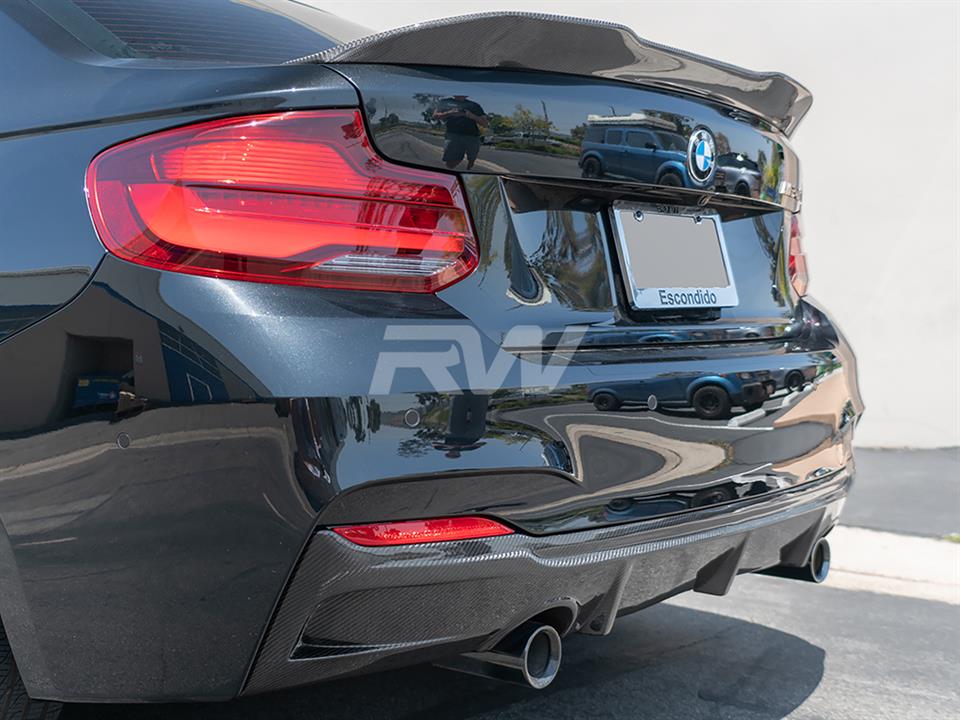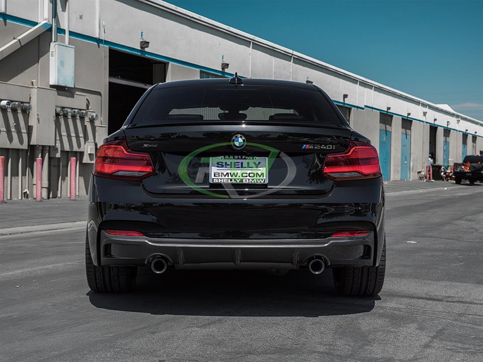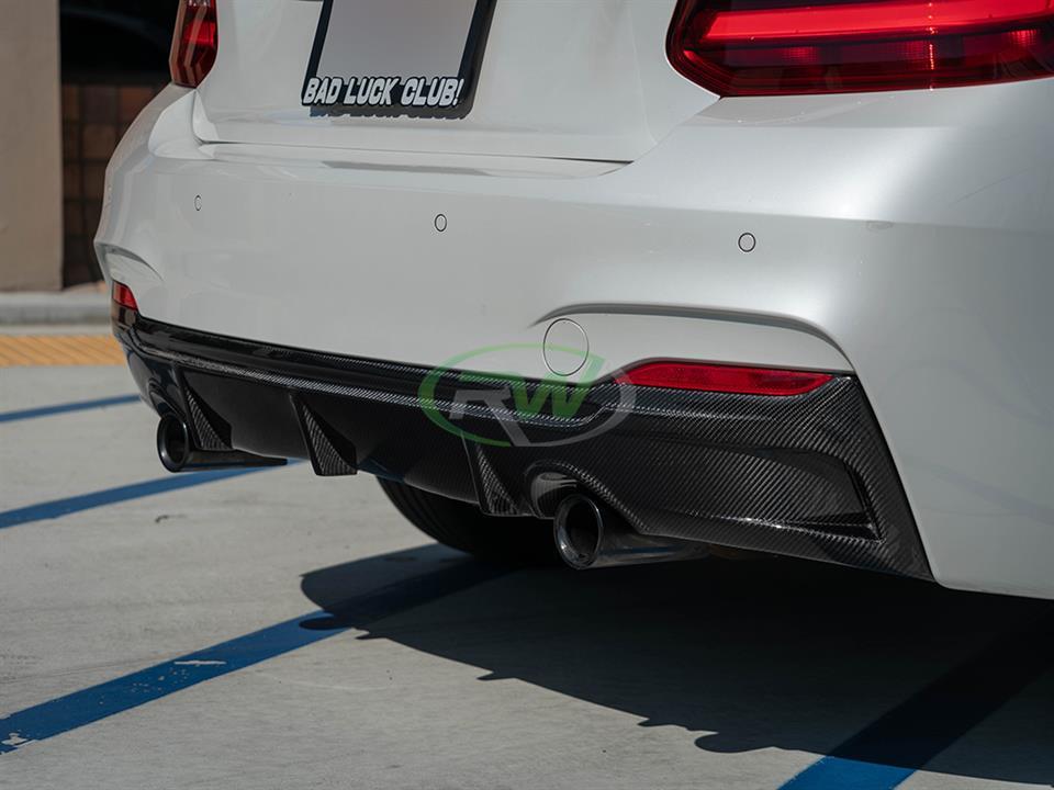 A carbon fiber rear diffuser is a must if you are going with other carbon fiber parts. It really brings the theme together and adds that race inspired feel to the rear end of your BMW F22 or F23 2 series. This diffuser features 2×2 carbon fiber weave that will match CF mirror caps or spoiler you already have installed on your car. We complete the diffuser with a high quality clear coat to reduce the chance of fading or discoloration after a few years of use. The carbon fiber diffuser will fit the 2014-2021 M235i and M240i right out of the box, if you have the 228i or 230i you will need a dual exit aftermarket exhaust. Please contact us if you have any questions.