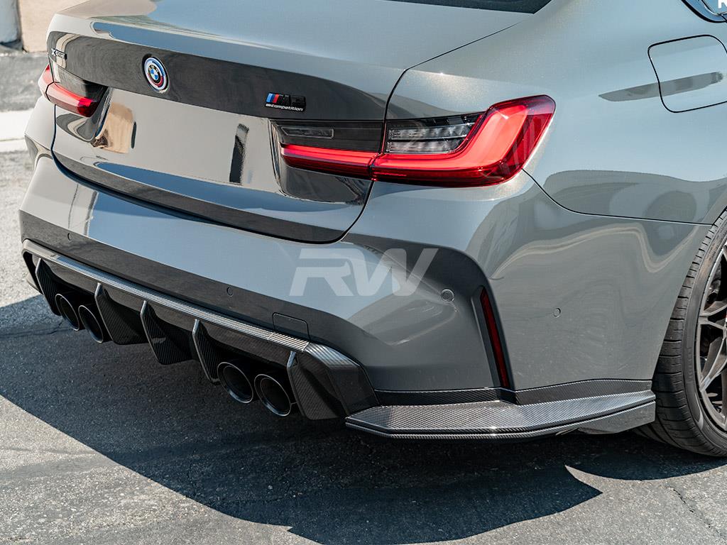 Enhance the rear profile of your BMW G80 M3 with our GTS Carbon Fiber Diffuser Sides. These pieces are crafted to pair perfectly with your factory or aftermarket center diffuser, providing a bold and aggressive aesthetic from every angle. Each set is made using genuine 2×2 weave carbon fiber and finished with a high-gloss, UV-resistant clear coat to ensure durability and shine over time. The design follows the lines of the rear bumper and adds a nice touch without looking overdone. These diffuser sides install seamlessly for a factory-like fitment. If you have any questions regarding this part, feel free to contact us!