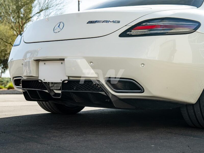 RW Carbon is very proud to introduce our first piece for the 2011-2014 Mercedes SLS Gullwing AMG, the Renn style carbon fiber rear diffuser. Our diffuser features FULL CARBON construction, making is ultra lightweight and durable. With great attention to detail, this diffuser features a tight carbon fiber weave along with a thick, high quality clear coat for that high gloss shine. These features help make this piece one you can be proud of to install on your SLS. Installation requires no special modifications and is simply bolt on and usually takes about an hour to complete. Unlike many other companies that make parts for your SLS we typically stock these SLS carbon fiber diffusers – No 4+ Month wait time when you order from RW Carbon. Please contact us about this SLS diffuser is you want availability or if you have any questions.